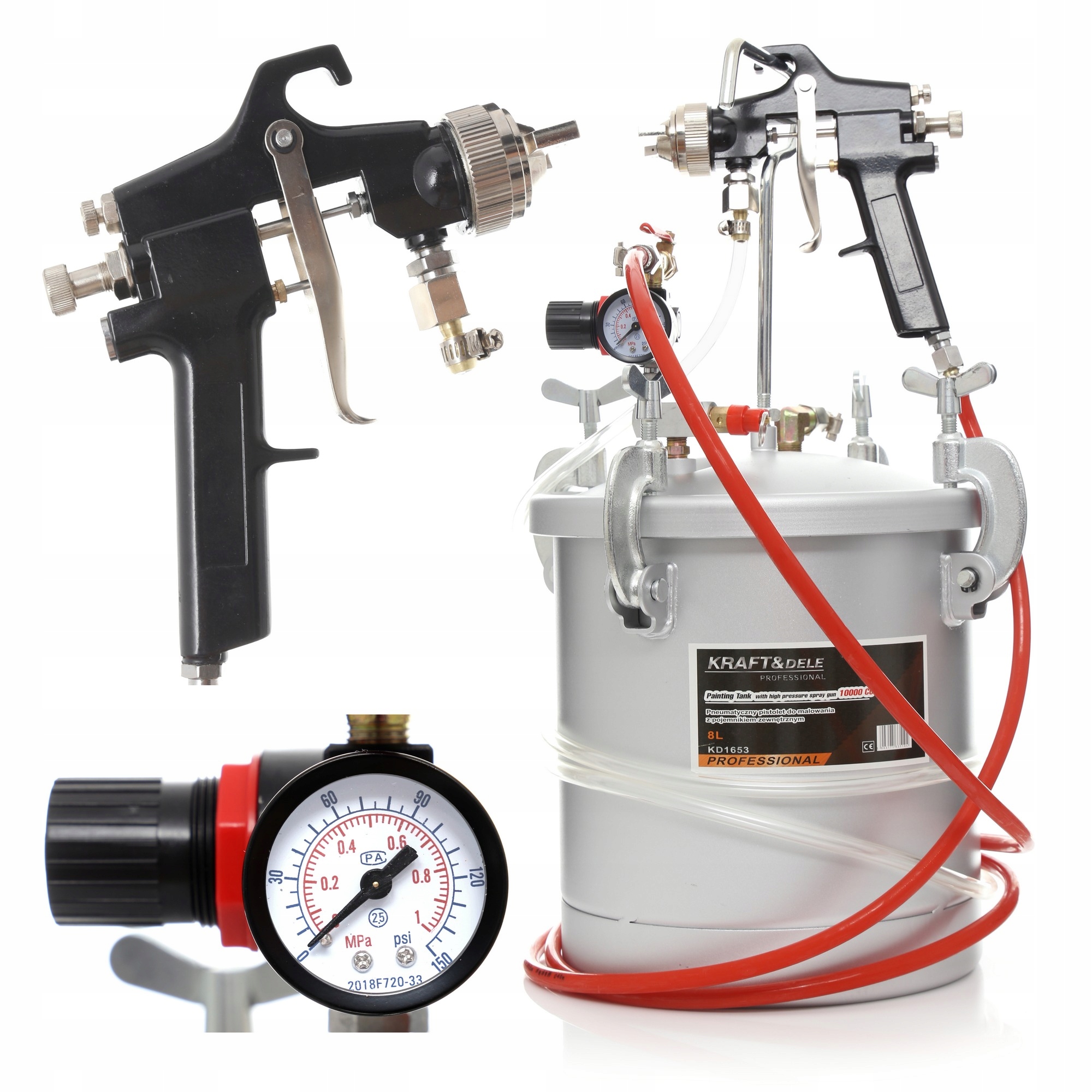 Zestaw posiada 8 l zbiornik wykonany z aluminium, na pokrywie którego mocowany jest reduktor ciśnienia, z manometrem i zaworem bezpieczeństwa. Do pistoletu lakierniczego farba podawana jest pod ciśnieniem i tam rozpylana jest przy pomocy sprężonego powietrza.Ciśnieniowy agregat malarski idealnie sprawdzi się przy malowaniu dużych powierzchni i nie tylko.