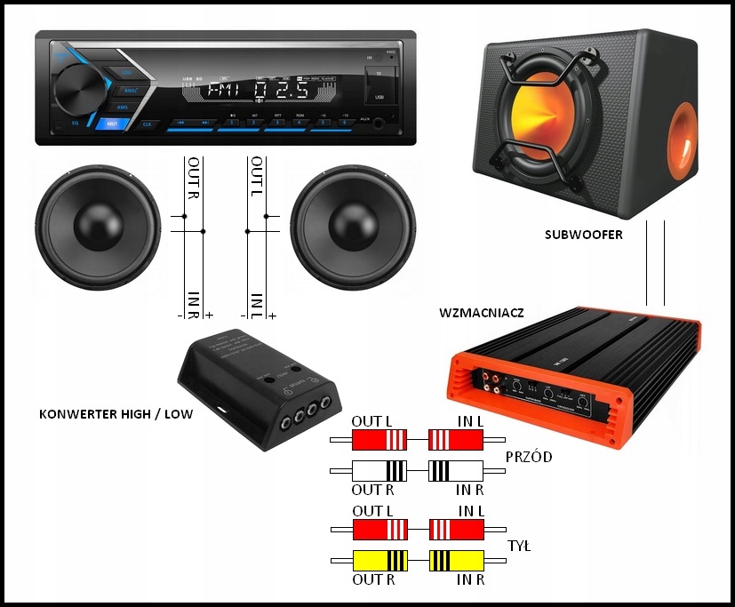 wyjścia sygnału audio o poziomie RCA (Low) dla kanału lewego i prawego (przód i tył) podłączane do wejść RCA we wzmacniaczu mocy