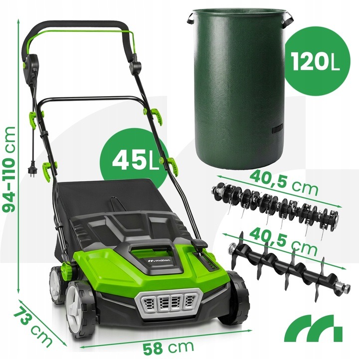 Aerator wertykulator elektryczny do trawy 38 cm kosz 45L + 120L mocny 2600W