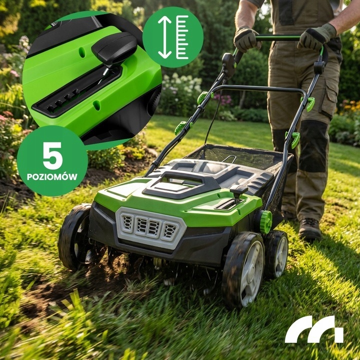 Dzięki temu możesz dobrać ustawienie idealnie do potrzeb: lżejsza praca przy regularnej pielęgnacji lub mocniejsze ustawienia, gdy trawnik jest zaniedbany i wymaga regeneracji.