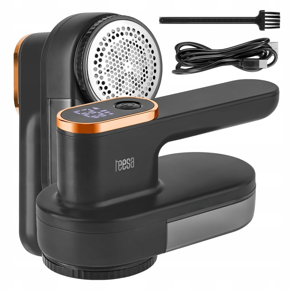 W zestawie z golarką do ubrań Teesa znajdziesz także praktyczne akcesoria. Pędzelek do czyszczenia umożliwia dokładne usunięcie resztek tkanin z ostrzy, przedłużając żywotność urządzenia, kabel USB-C do ładowania, a także nakładkę chroniącą ostrza podczas przechowywania.