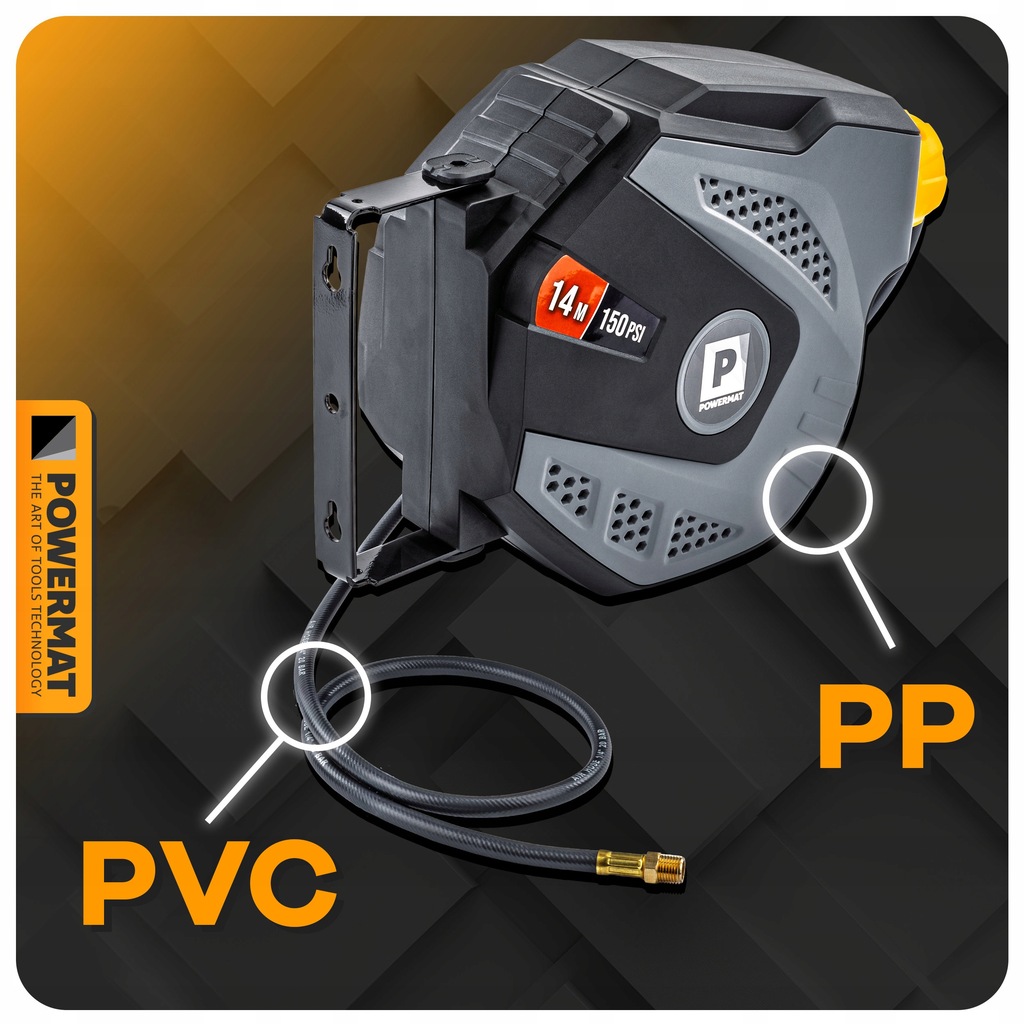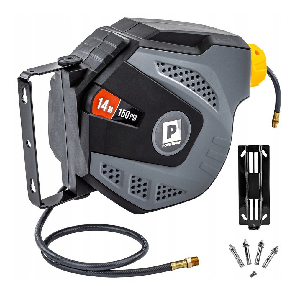Automatyczny bęben z wężem pneumatycznym Powermat to praktyczne urządzenie ułatwiające prace warsztatowe. Dzięki automatycznemu zwijaniu, możliwości obrotu o 180° i kompaktowej, odpornej obudowie PP, zapewnia wygodę użytkowania i oszczędność miejsca. Produkt przeznaczony jest do domowych zastosowań, zapewnia bezpieczeństwo dzięki blokadzie węża i prostemu montażowi.