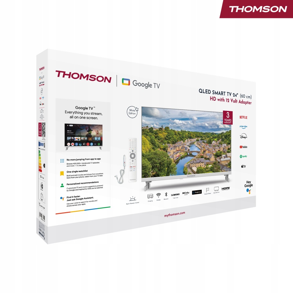 Biały Telewizor do kampera 12V Smart tv THOMSON 24'' Google WiFi BT DVBT2
