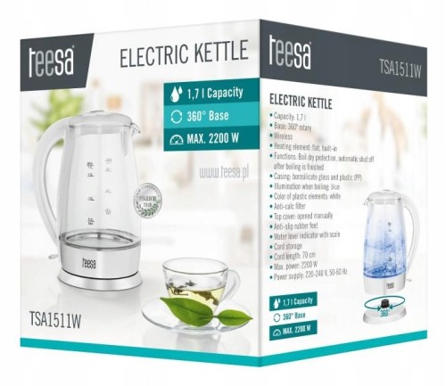 To, co wyróżnia czajnik elektryczny Teesa, to wykorzystanie trwałego i odpornego na zabrudzenia szkła borokrzemianowego, którego dopełnieniem są elementy wykonane z wysokiej jakości plastiku. Moc maksymalna 2200 W oraz płaska grzałka płytowa pozwalają na szybkie zagotowanie wody. Specjalnie wyprofilowany dziobek umożliwia zalewanie filiżanek bez rozlewania na boki. Czajnik zaopatrzony w obrotową i odłączaną podstawę.