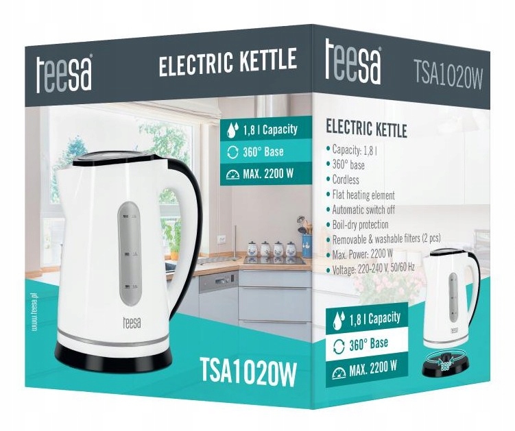 Wysokogatunkowe tworzywo, z którego został wykonany czajnik Teesa sprawia, że urządzenie idealnie wkomponuje się w niemal każdy wystrój kuchni. Duża pojemność 1,8 l oraz moc maksymalna 2200W umożliwiają szybkie zagotowanie dużej ilości wody, a bardzo cichy element grzejny zapewnia prawie niesłyszalną pracę. Produkt posiada obrotową podstawę, dzięki czemu zapewnia komfort obsługi zarówno użytkownikom praworęcznym, jak i leworęcznym. Automatyczne wyłączanie oraz zabezpieczenie przed włączeniem bez wody zapewnią bezpieczeństwo użytkowania, a podświetlenie w czasie pracy przypomni, kiedy czajnik jest włączony. Produkt posiada wyjmowany filtr, który chroni przed wydostawaniem się kamienia, powstającego podczas gotowania wody.
