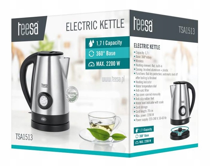 Czajnik z płaską grzałką płytową pozwala zagotować każdą, nawet najmniejszą ilość wody. Jeśli natomiast potrzebujesz zagotować pełną pojemność 1,7 l, czajnik Teesa o mocy 2200 W pozwoli Ci na to w dość krótkim czasie. Bezpieczeństwo użytkowania urządzenia zapewnia funkcja automatycznego wyłączania oraz zabezpieczenia przed włączeniem bez wody.