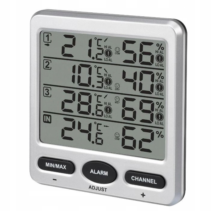 Stacja bazowa posiada możliwość włączenia alarmu, gdy zmierzona wartość przekroczy lub spadnie poniżej wartości granicznej temperatury lub wilgotności powietrza (można ustawić osobno dla temperatury/wilgotności powietrza wewnątrz oraz temperatury/wilgotności powietrza każdego czujnika zewnętrznego).
