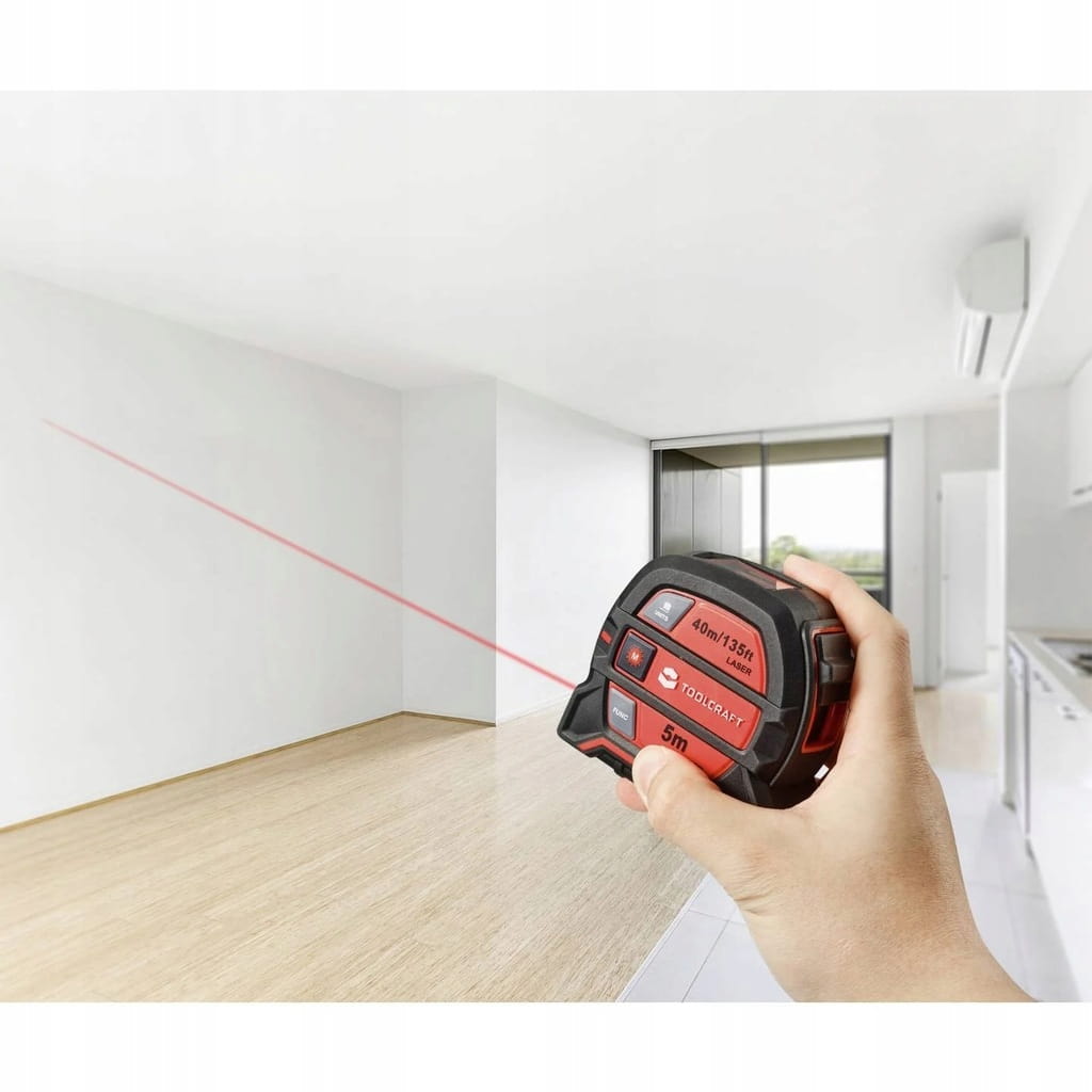 Jest idealny do pomiaru odległości między dwiema powierzchniami, szacowania dywanów, płytek, pomiaru ściany do malowania lub pomiaru wysokości ściany bez użycia drabiny.