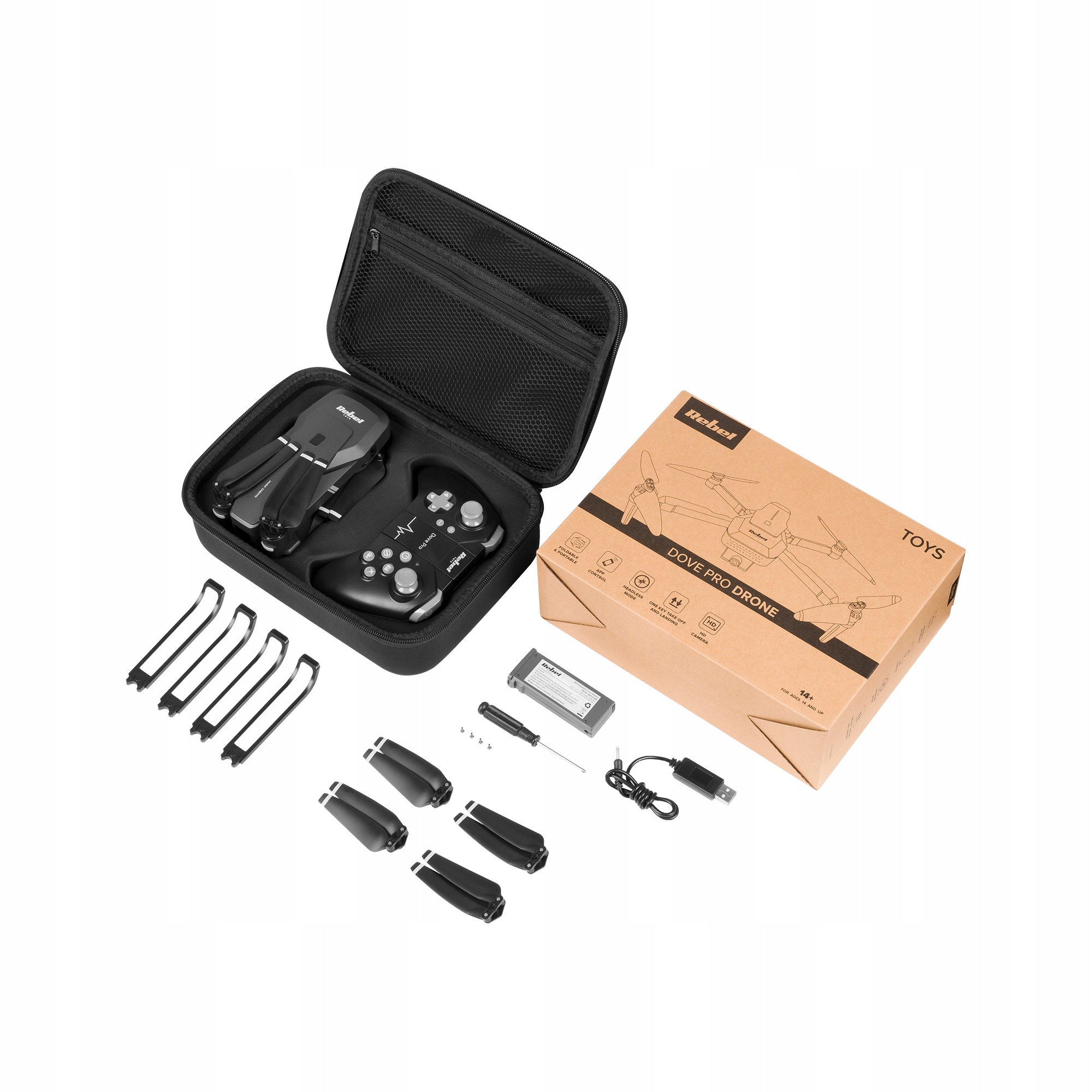 Aby komfortowo sterować dronem, w zestawie znajdziesz dedykowany kontroler. Jednak DOVE PRO daje Ci więcej możliwości! Wszystkimi funkcjami, w tym także sterowaniem dronem, możesz zarządzać za pośrednictwem smartfona w dedykowanej aplikacji REBEL TOYS.