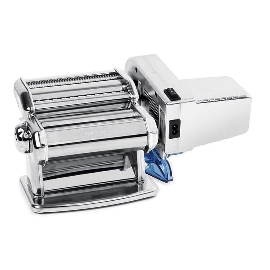 Niezwykle funkcjonalna i mocna maszynka. Konstrukcja z grubej i polerowanej stali nierdzewnej. Zestaw zaopatrzony w przystawkę do krojenia ciasta na nitki. W głównej części korpusu umieszczono 2 wałki o regulowanym docisku, które służą do wcześniejszego rozwałkowania ciasta na plaster. Wałki tnące oraz inne elementy mechaniczne wykonane z utwardzanej stali. Regulowana klamra dołączona do zestawu umożliwia trwały montaż maszynki do blatu. Na wyposażeniu mocny napęd elektryczny z możliwość odłączenia od maszynki. Urządzenie charakteryzuje się zerową awaryjnością elementów mechanicznych. Zestaw łatwo się myje i czyści.