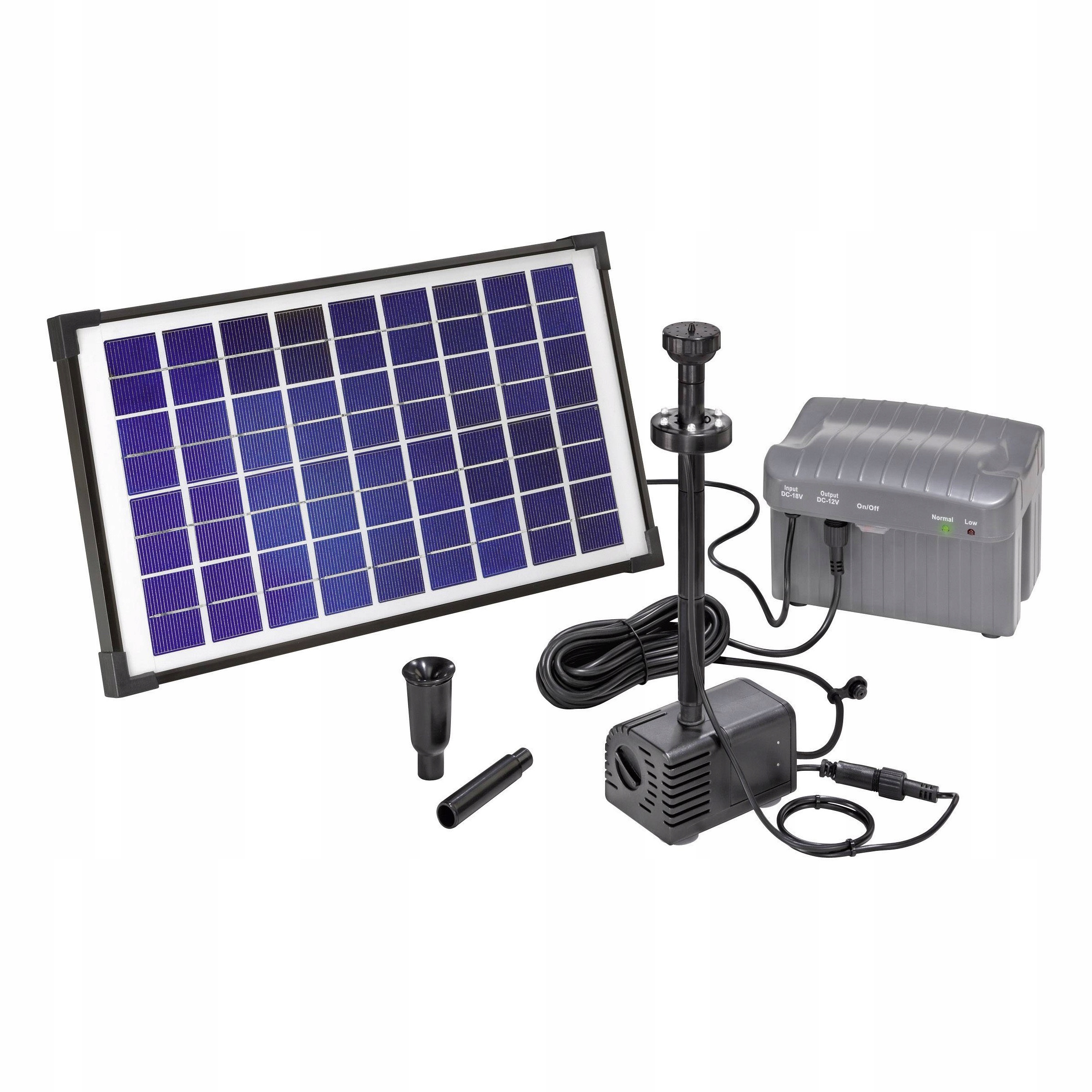 Napoli LED to Idealne połączenie baterii słonecznej akumulatora pompy wody i podświetlenia LED. Efektownie podświetlona fontanna do oczka wodnego lub źródełka będzie ozdobą każdego ogrodu. Bateria słoneczna przy świetle słonecznym pobiera wystarczająco dużo energii by zasilać pompę i ładować akumulator. Dzięki temu także wieczorem oczko wodne jest pięknie podświetlone. Dodatkowo istnieje możliwość przestawienia pompy i podświetlenia na działanie od wieczora przełącznikiem na akumulatorze, dzięki czemu można podziwiać pokaz świetlny przez wiele godzin po zmroku. Dzięki wbudowanej regulacji w akumulatorze można przestawiać napięcie pomiędzy 12 i 24 V, a co za tym idzie - wydajność pompy. System posiada zabezpieczenie przed działaniem na sucho i przeciążeniem. Dzięki dołączonym 4 rurom i 2 różnym spryskiwaczom (trzystopniowe fontanny i kopuły wodne) można uzyskać wiele różnych kształtów fontanny.