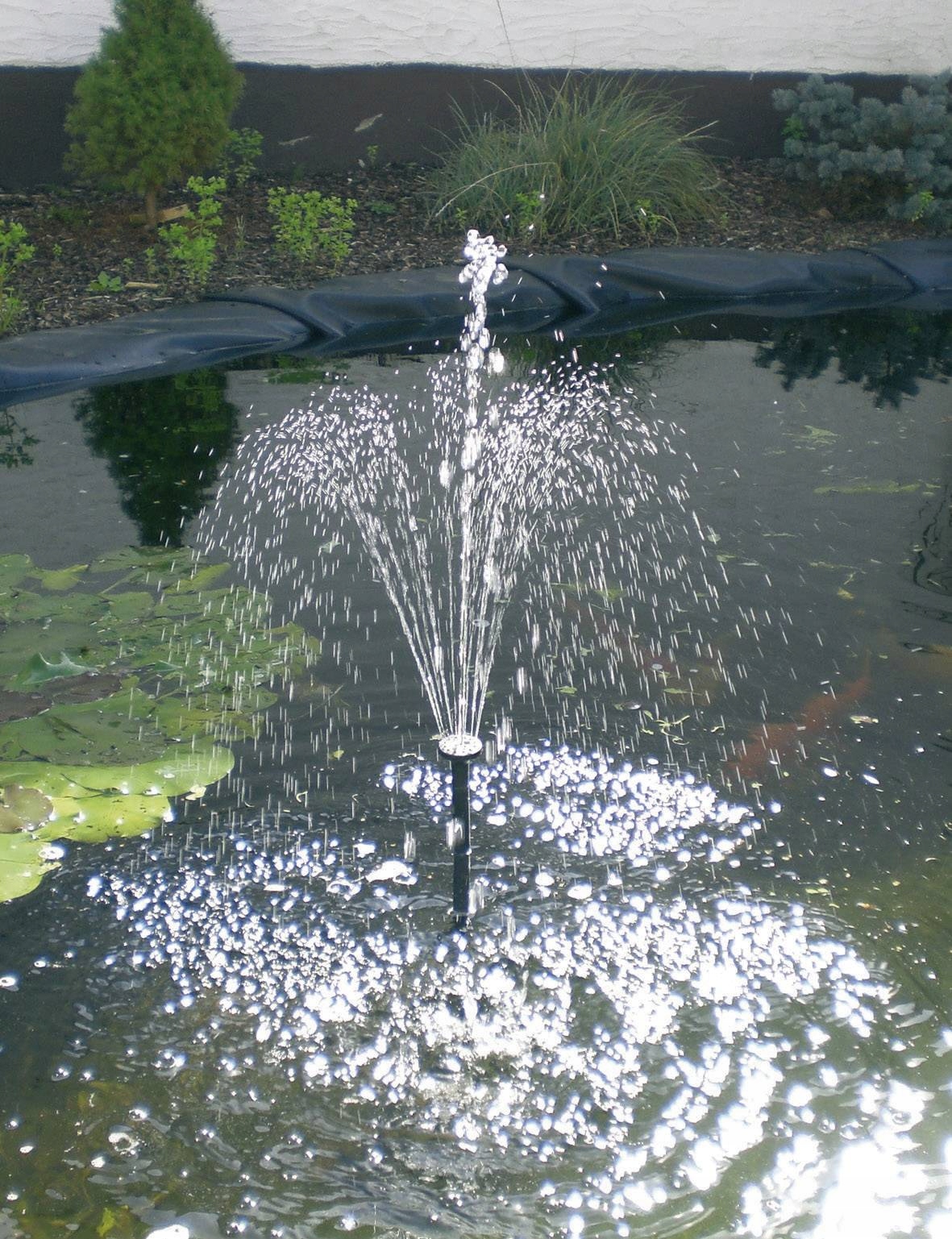 Wykorzystaj moc słońca i stwórz z zestawem solarnym fontannę lub słup wody. Gotowy do podłączenia system jest dziecinnie łatwy w eksploatacji. Dzięki dołączonym nakładkom na dysze możliwe jest utworzenie różnorodnych fontann wodnych. Niskie zużycie energii zapewnia polikrystaliczny moduł słoneczny oraz pompa wodna zaopatrzona w silnik bezszczotkowy.