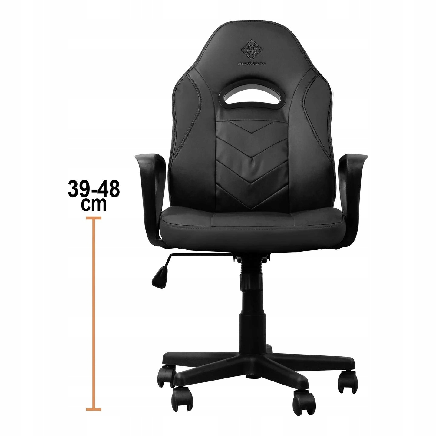 Idealny fotel gamingowy dla młodych graczy. Krzesło wykonane z wysokiej jakości czarnej imitacji skóry posiada obrotową 5-punktową podstawe na kółkach i można ją bezstopniowo regulować na wysokość.