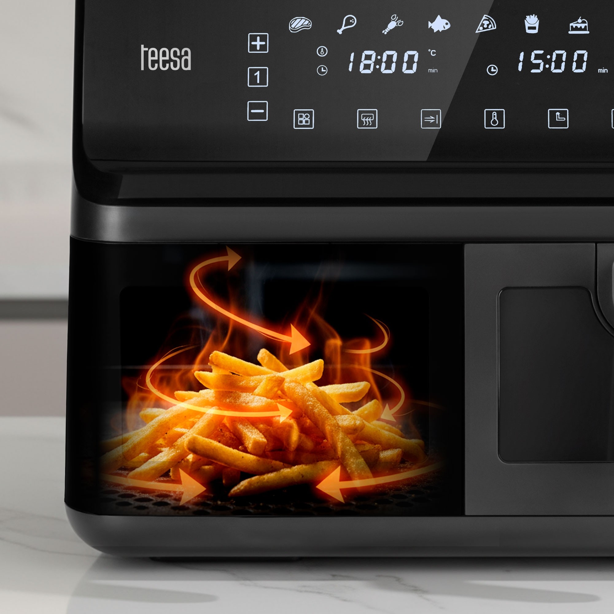Frytkownica beztłuszczowa Teesa wykorzystuje zaawansowaną cyrkulację gorącego powietrza, która umożliwia błyskawiczne nagrzewanie urządzenia. Dzięki temu potrawy przygotowują się szybciej, równomiernie się rumienią i zachowują naturalny smak oraz wartości odżywcze – bez konieczności dodawania tłuszczu.