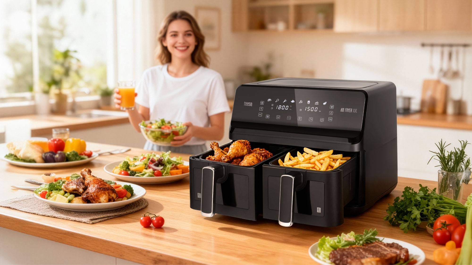 Dzięki frytkownicy beztłuszczowej AIR FRYER DUAL POT możesz cieszyć się ulubionymi potrawami w zdrowszej wersji. Urządzenie wykorzystuje gorące powietrze zamiast dużej ilości tłuszczu, dzięki czemu dania są lekkie, chrupiące i mniej kaloryczne. To idealne rozwiązanie dla osób, które chcą zadbać o zdrowie, nie rezygnując z wyjątkowego smaku.