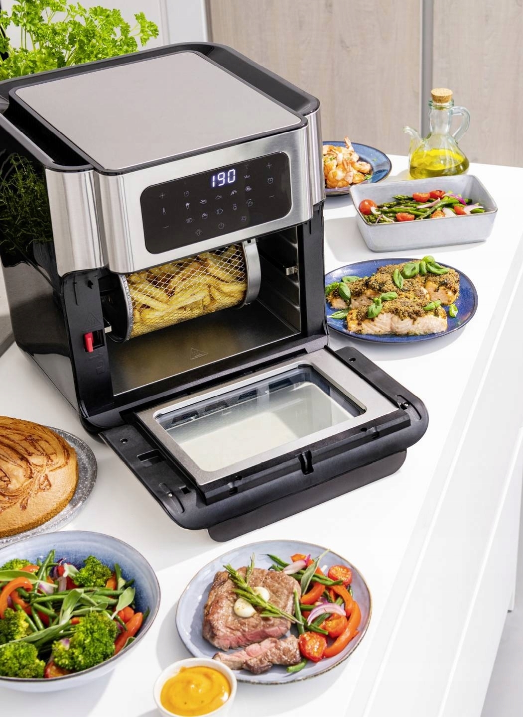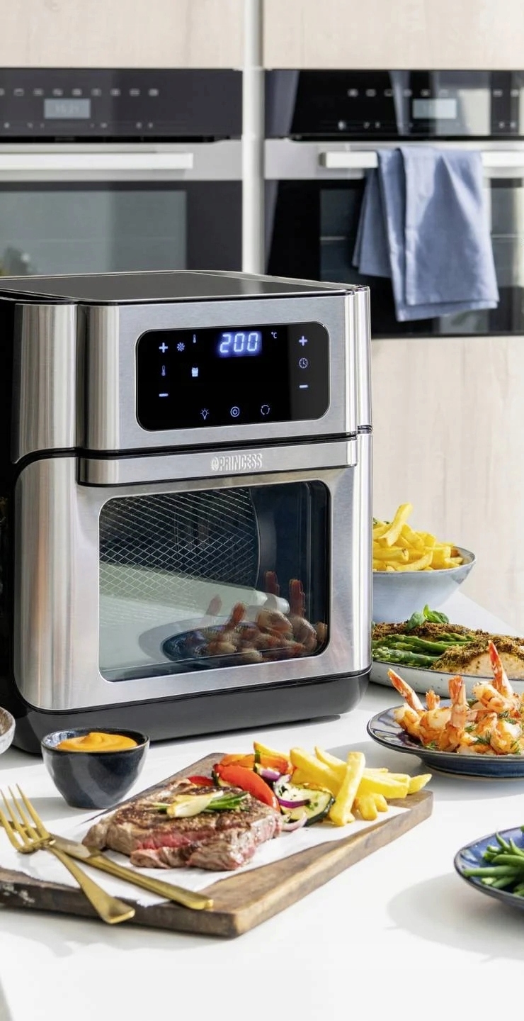 Luksusowe połączenie frytownicy i mini piekarnika umożliwia grillowanie, pieczenie, smażenie w głębokim tłuszczu, smażenie, a nawet suszenie.