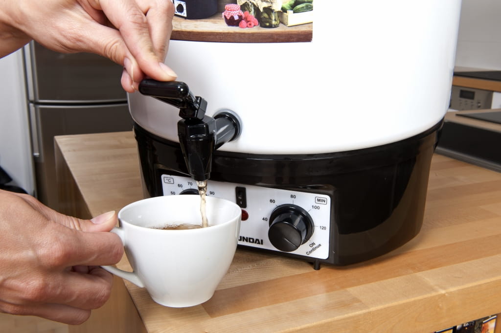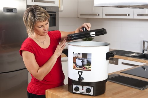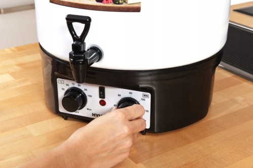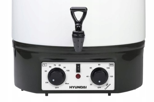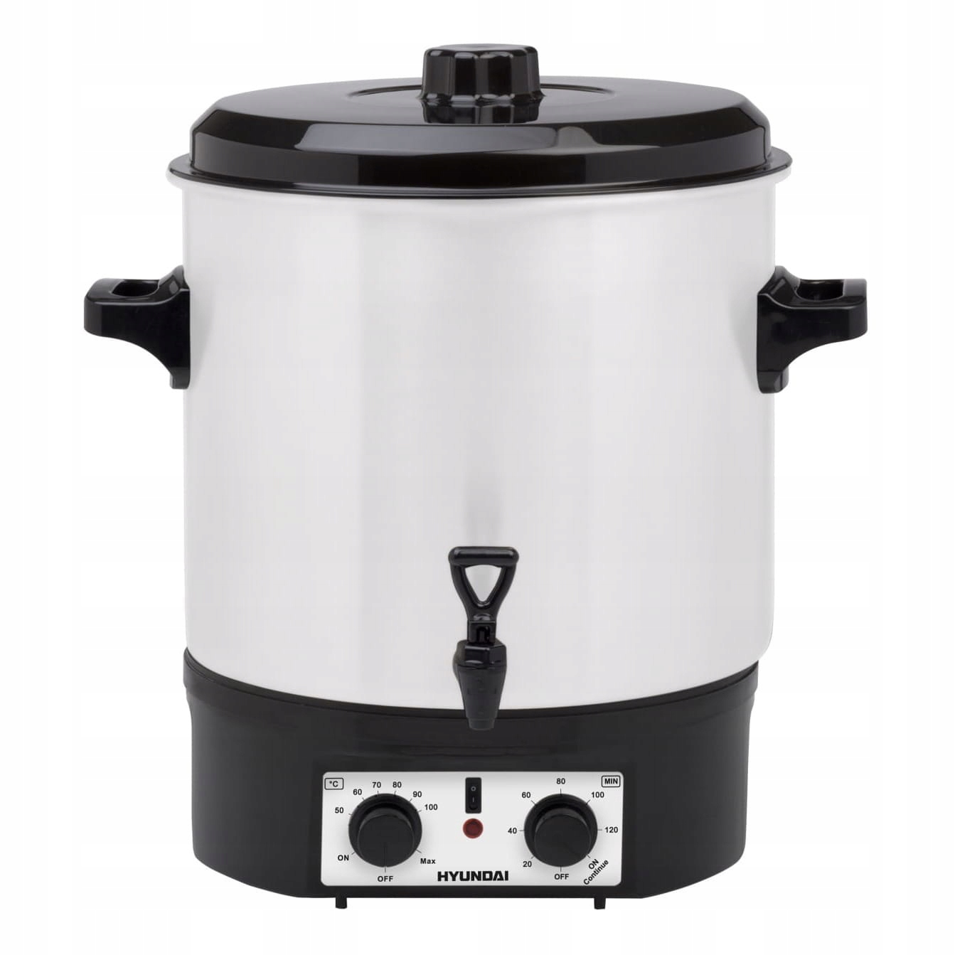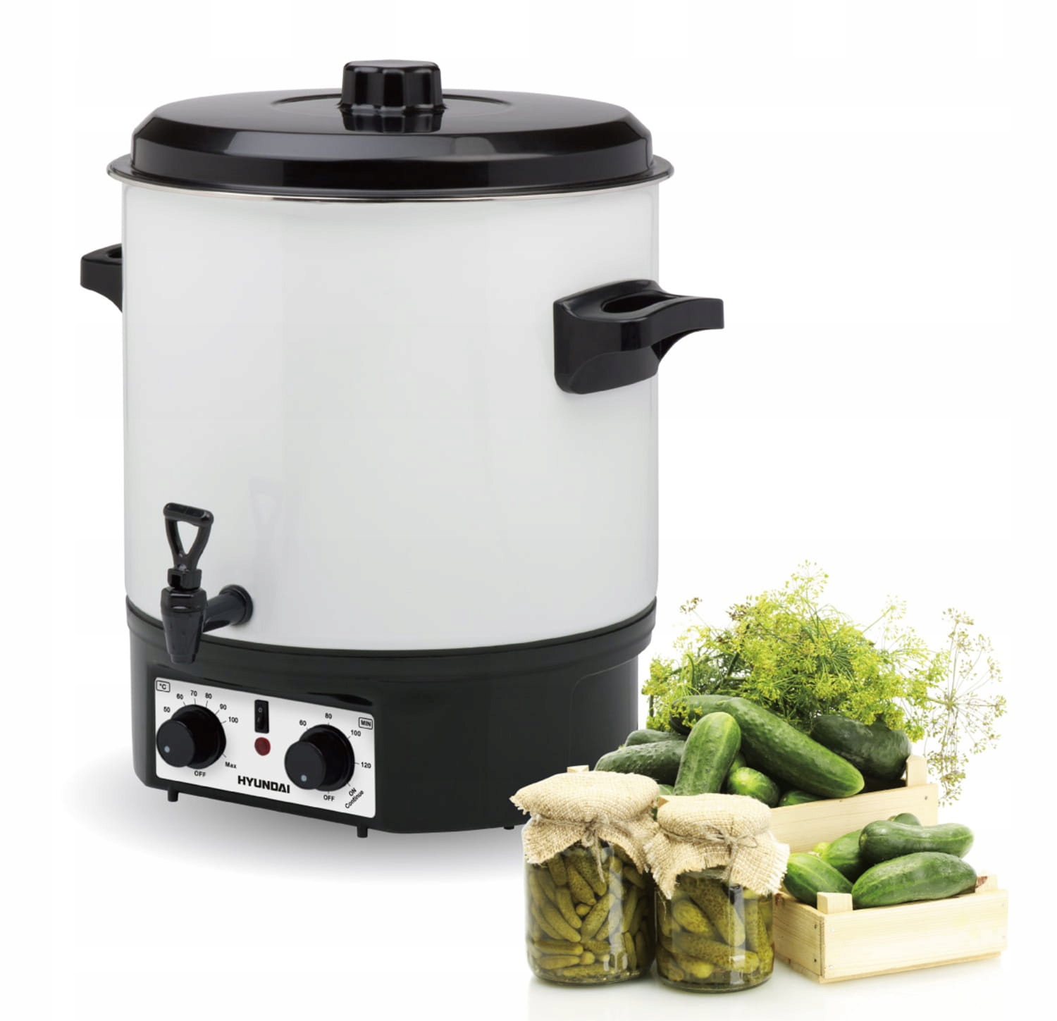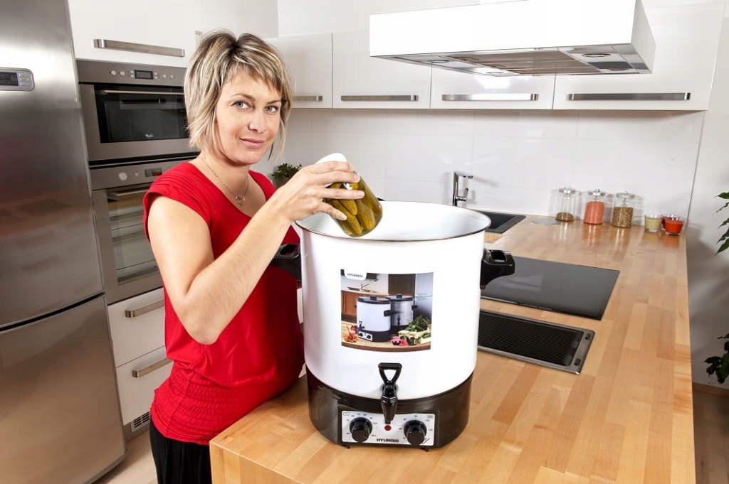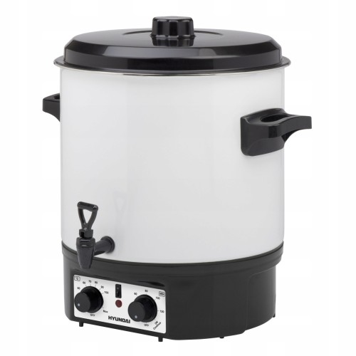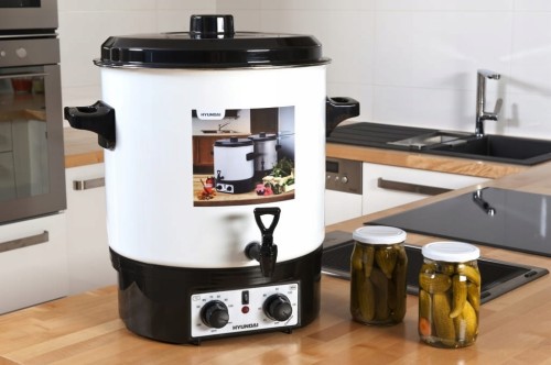 Garnek elektryczny Hyundai o mocy 1800 W znacznie ułatwia proces konserwacji i sterylizacji słoików z przetworami, a także pomaga w przygotowaniu gorących napojów, zup i gulaszów. Ma pojemność 27 litrów i średnicę 32.5 cm, co pozwala pomieścić 14 jednolitrowych słoików. Swobodna regulacja temperatury w zakresie 50-100°C, osiągnięcie odpowiedniej temperatury sygnalizowane jest dźwiękiem. Do dyspozycji jest timer od 20 do 120 minut z możliwością zaprogramowania pracy bez ograniczeń czasowych. Woda odprowadzana jest z łatwością przez zawór wylotowy. Wnętrze garnka zostało wykonane ze stali nierdzewnej emaliowanej, a grzałka ukryta jest w płaskim dnie. Uchwyty są izolowane termicznie, a dodatkowo garnek jest wyposażony w zabezpieczenie przed przegrzaniem i pracą na sucho.