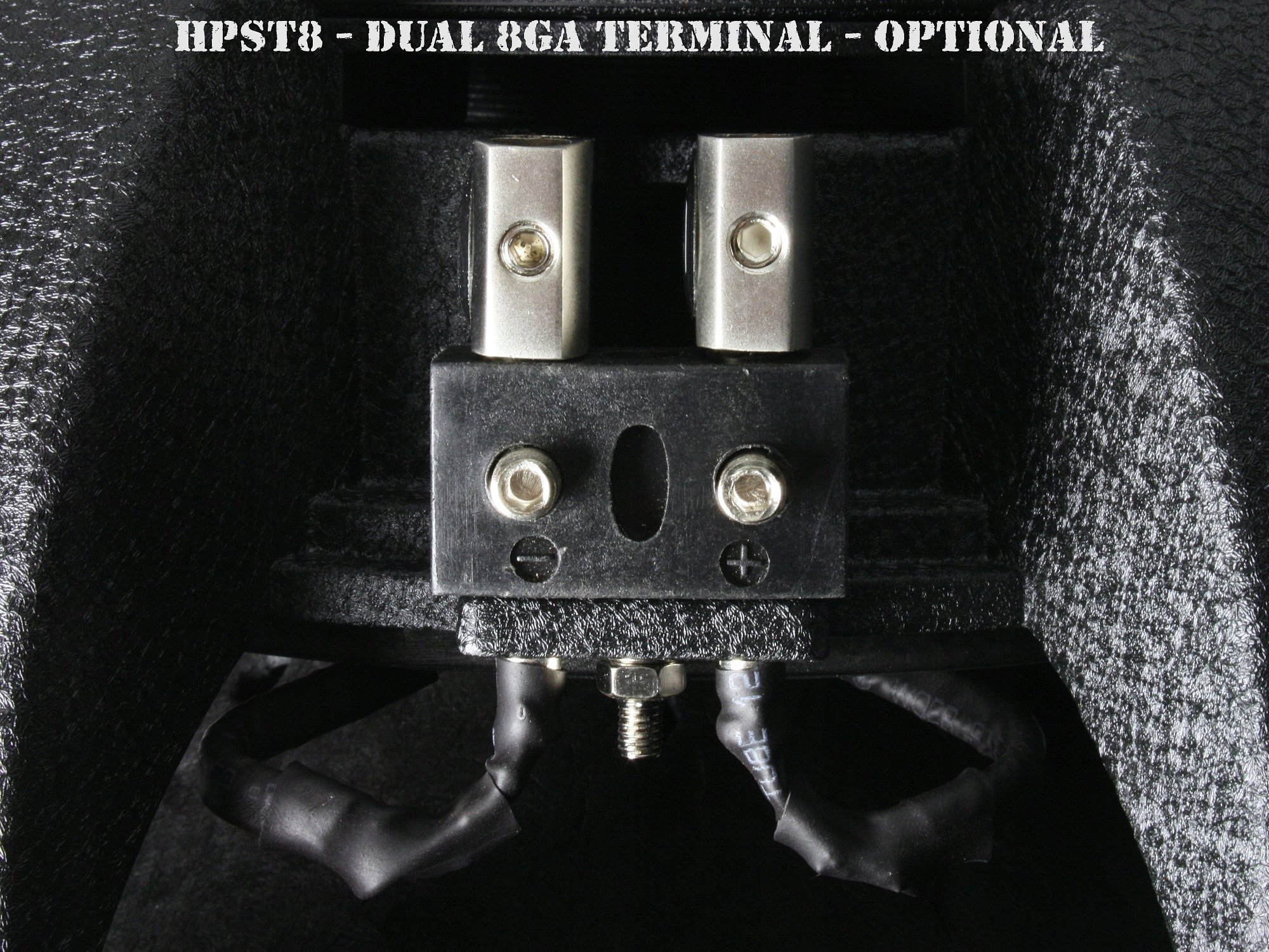 - 2 profesjonalne terminale z wkrętami imbusowymi umożliwiające podłączenie kabli głośnikowych o przekroju do 4x8,5 mm2 (lub do 8x10 mm2 po zastosowaniu dodatkowych terminali Hollywood HPST-8).