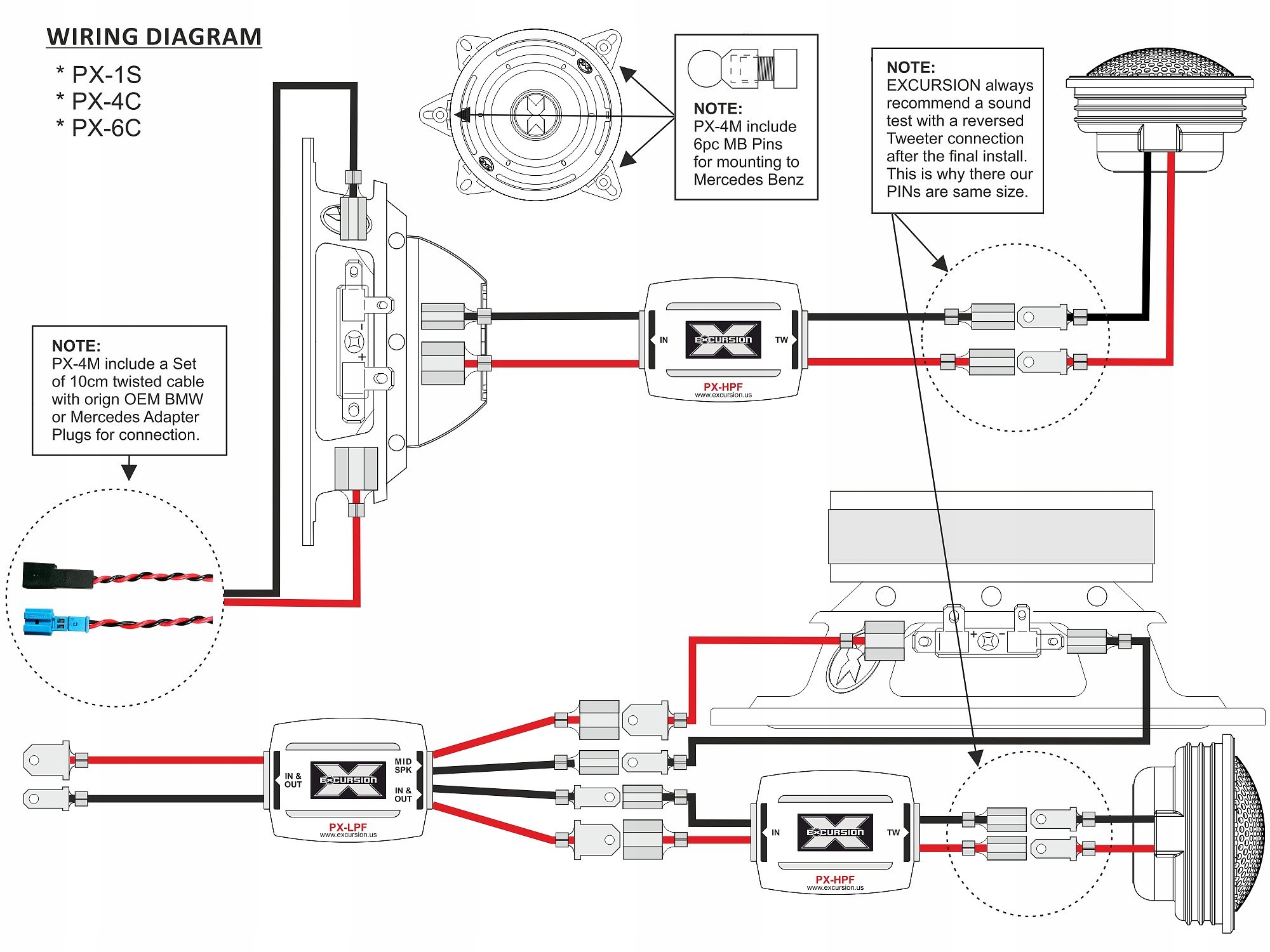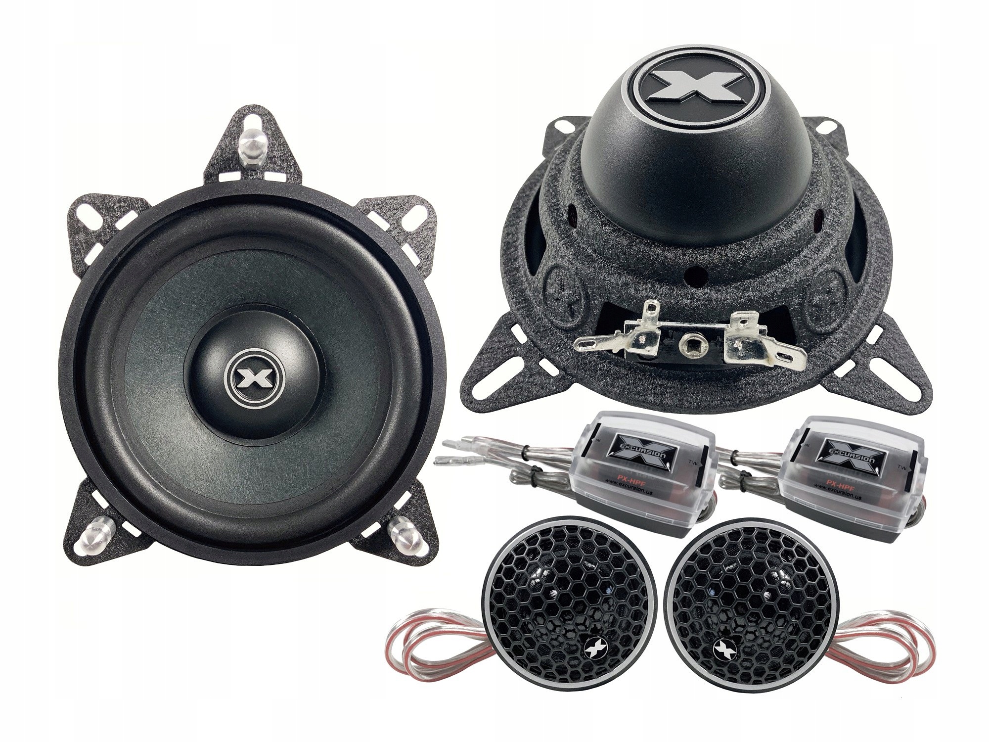 2-drożny zestaw samochodowych głośników odseparowanych z mid-wooferami o wymiarach 110x120 mm niemieckiej marki Excursion z serii PX Performance. Po seriach SX i SHX seria Performance (PX) reprezentuje w ofercie Excursion jeszcze wyższy, trzeci poziom jakości i wydajności. Zestaw głośnikowy PX-4C, to bardziej zaawansowane technologicznie i brzmieniowo produkty klasy SQ (Sound Quality) przeznaczone do uniwersalnych zastosowań we wszystkich pojazdach z miejscami montażowymi DIN 4"/100mm oraz w samochodach BMW i Mercedes Benz. W skład zestawu Excursion PX-4C wchodzą selekcjonowane japońskie głośniki wysokotonowe (tweetery) Excursion PX-1S z jedwabnymi kopułkami 26 mm i komorami powietrznymi bez ferrofluidu, głośniki średnio-niskotonowe (mid-woofery) 4"/100mm Excursion PX-4M, zwrotnice pasywne PX-HPF 6 dB/okt. dla głośników wysokotonowych, akcesoria montażowe oraz przewody ze złączami do instalacji w BMW i Mercedes.