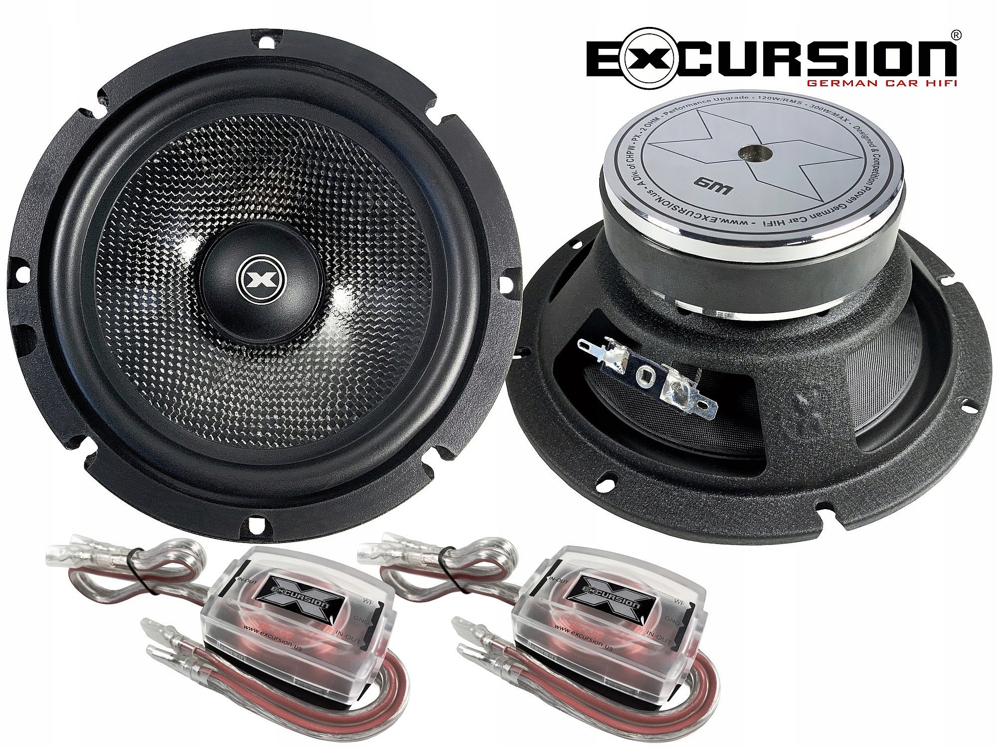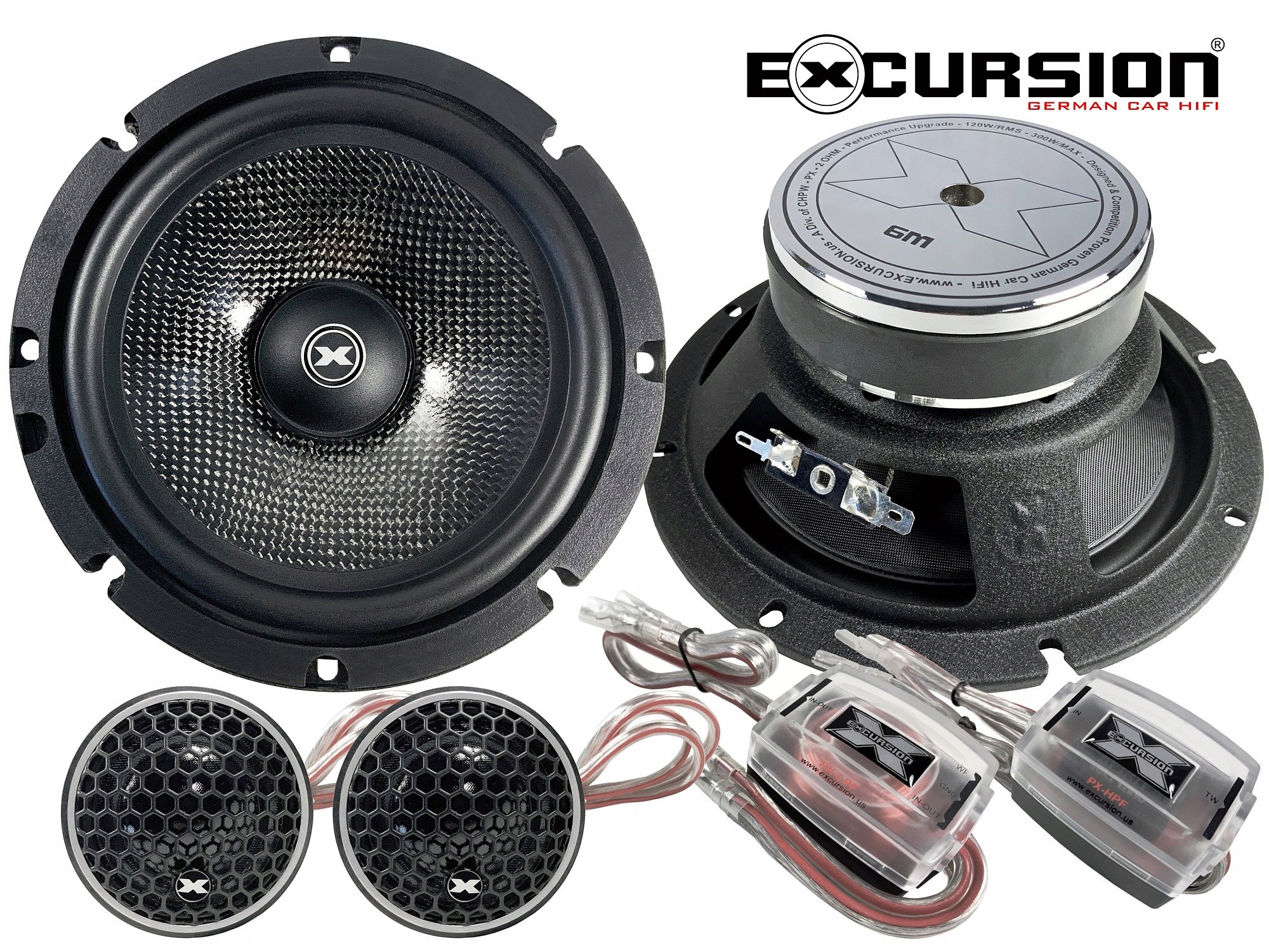 2-drożny zestaw samochodowych głośników odseparowanych z mid-wooferami o średnicy 165 mm niemieckiej marki Excursion z serii PX Performance. Po seriach SX i SHX seria Performance (PX) reprezentuje w ofercie Excursion jeszcze wyższy, trzeci poziom jakości i wydajności. Zestaw głośnikowy PX-6C, to bardziej zaawansowane technologicznie i brzmieniowo produkty klasy SQ (Sound Quality) przeznaczone do uniwersalnych zastosowań oraz jako zamienniki fabrycznych systemów głośnikowych (OEM). W skład zestawu Excursion PX-6C wchodzą selekcjonowane japońskie głośniki wysokotonowe (tweetery) Excursion PX-1S z jedwabnymi kopułkami 26 mm i komorami powietrznymi bez ferrofluidu, głośniki średnio-niskotonowe (mid-woofery) 6,5"/165mm Excursion PX-6M, dwie zwrotnice pasywne PX-HPF 6 dB/okt. dla głośników wysokotonowych, dwie zwrotnice pasywne PX-LPF 6 dB/okt. dla głośników średnio-niskotonowych oraz przewody głośnikowe z miedzi beztlenowej (OFC).