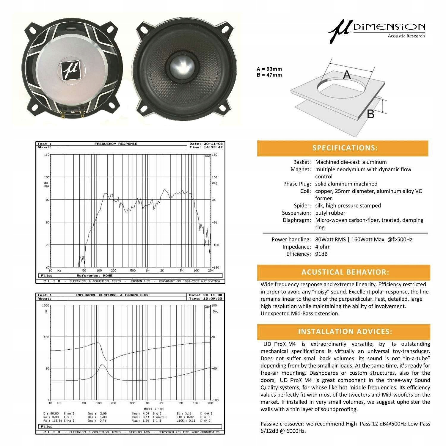 Wysokiej jakości audiofilskie samochodowe głośniki średniotonowe o średnicy 100 mm ze stożkową membraną wykonaną z utkanych mikro włókien szklanych i węglowych (fiberglass/carbon). Głośniki posiadają sztywny kosz odlewany z aluminium, neodymowy multi-magnes z systemem chłodzenia miedzianej cewki (25 mm), zawieszenie z gumy butylowej oraz aluminiowy korektor fazy. Głośniki zostały zaprojektowane i wyprodukowane we Włoszech specjalnie dla bardziej wymagającej grupy klientów i zawodników Sound Quality. Produkt jest głównie dedykowany do bezpośredniego montażu (np. w słupkach, desce rozdzielczej, na tapicerce drzwiowej) w autoryzowanej sieci instalatorów. Głośniki mogą pracować tak w małych komorach zamkniętych jak i w zabudowie free-air z przegrodą akustyczną.