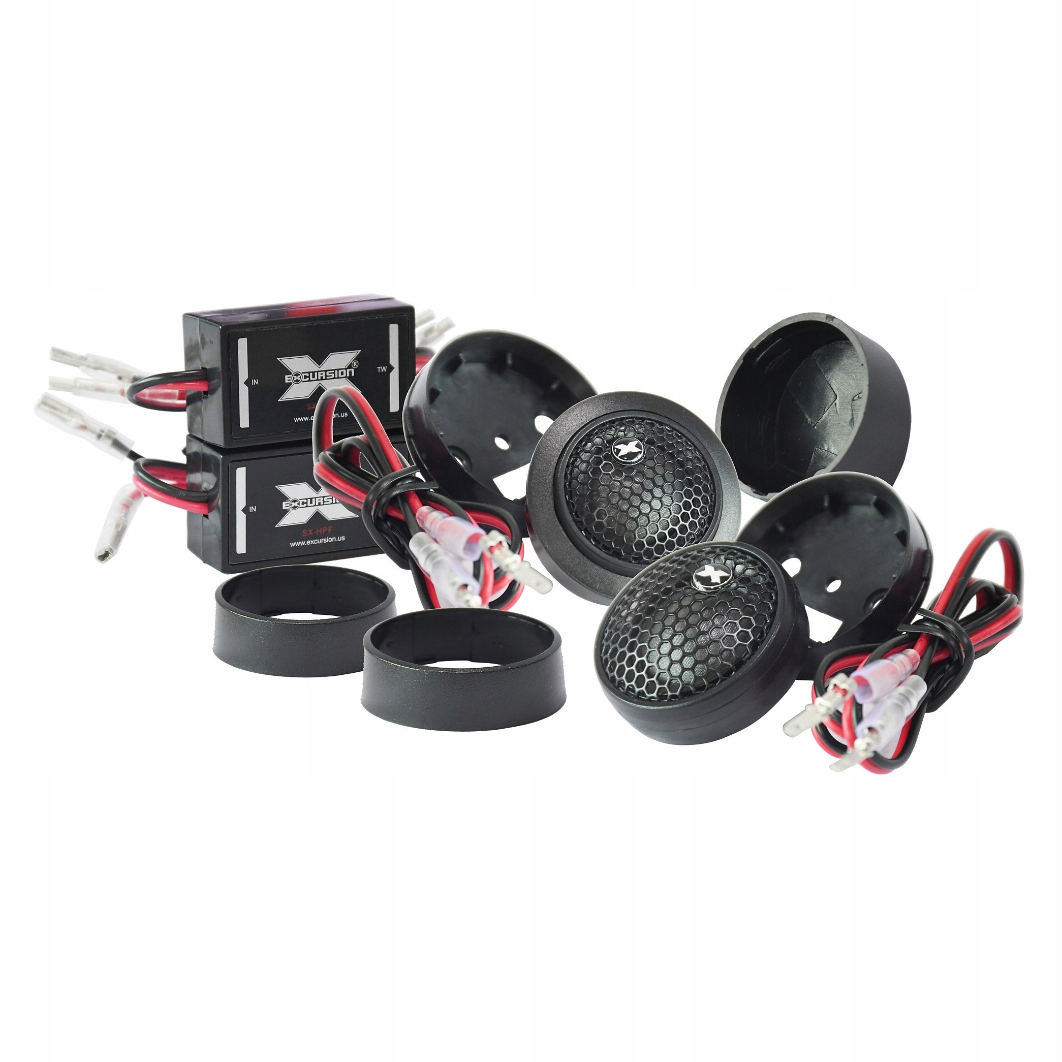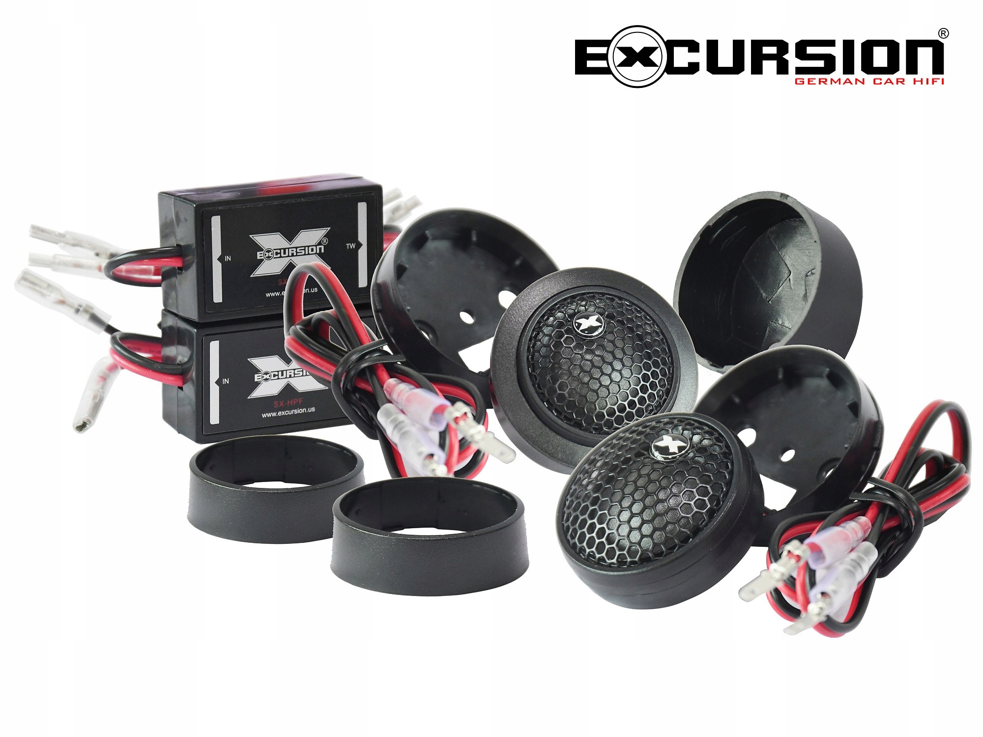 Samochodowe głośniki wysokotonowe marki Excursion posiadające membrany kopułkowe o średnicy 20 mm wykonane z czystego naturalnego jedwabiu, które w tym przedziale cenowym są praktycznie bez konkurencji. Głośniki charakteryzują się wysoką skutecznością oraz naturalnie zrównoważonym i szczegółowym brzmieniem najwyższych tonów pasma akustycznego. Podczas projektowania dużą wagę przywiązano do towarzyszącego osprzętu, aby nie marnować wysokiego potencjału tych głośników. Począwszy od doboru optymalnych połączeń wtykowych, poprzez wysokiej jakości kable głośnikowe z miedzi beztlenowej (OFC), aż po możliwie najmniejsze, ale zbudowane bez oszczędności zwrotnice pasywne wyposażone w wysokiej jakości kondensatory audio MKP zamontowane na płytkach drukowanych z solidnymi miedzianymi ścieżkami. Te małe pasywne filtry górnoprzepustowe (HPF) są idealnym rozwiązaniem pozbawionym całego niepotrzebnego balastu akcesoriów i gadżetów, które tylko nadmiernie "obciążają" dźwięk i portfel. Zwrotnice umożliwiają bardzo wygodny i łatwy montaż, elastyczny wybór polaryzacji oraz redukcję poziomu sygnału od 2 do 10 dB przy współpracy z opcjonalnymi tłumikami rezystancyjnymi Excursion XLR. W zestawie znajdują się również obudowy montażowe umożliwiające indywidualne ukierunkowanie głośników i szeroki zakres regulacji kąta propagacji dźwięku.
