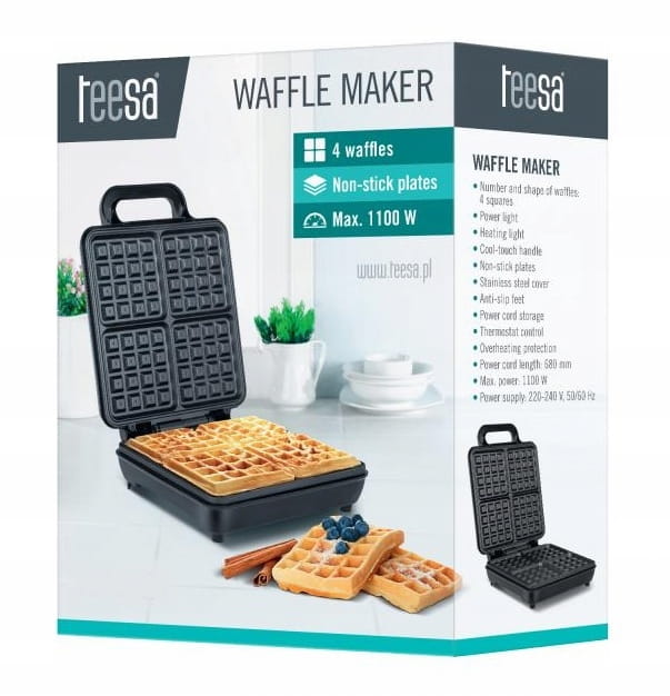 Lubisz zaskakiwać swoich najbliższych pysznymi przekąskami? Mamy dla Ciebie urządzenie, dzięki któremu jeszcze bardziej rozpieścisz ich podniebienia. Gofrownica o dużej mocy 1100 W, umożliwia zrobienie aż czterech gofrów jednocześnie. Wskaźnik gotowości urządzenia do pracy oraz teflonowa powłoka płytek chroniąca przed przywieraniem ciasta sprawiają, że przygotowanie pyszności gofrownicą Teesa jest proste i szybkie oraz bardzo przyjemne. Wystarczy, że doskonale wypieczone chrupiące ciasto dowolnie udekorujesz cukrem pudrem lub bitą śmietaną z owocami, by móc rozkoszować się smakiem tej pysznej przekąski.