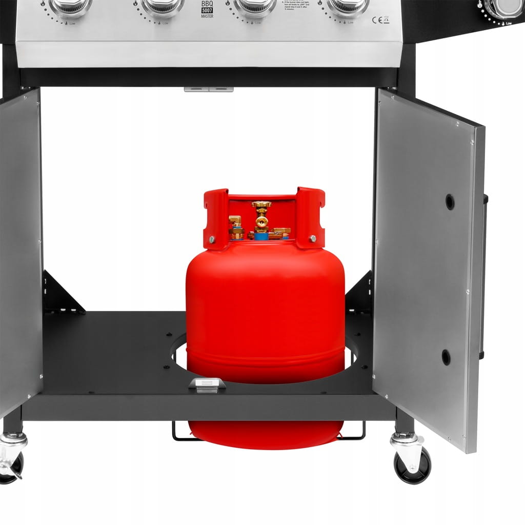Grill Teesa BBQ 5007 MASTER posiada przestronną szafkę, która umożliwia bezpieczne przechowywanie butli gazowej o pojemności do 11 kg. Dzięki temu gaz pozostaje ukryty, co poprawia estetykę i bezpieczeństwo użytkowania. Solidne drzwi ze stali nierdzewnej ułatwiają dostęp, a stabilna konstrukcja na kółkach pozwala na wygodne przemieszczanie grilla.