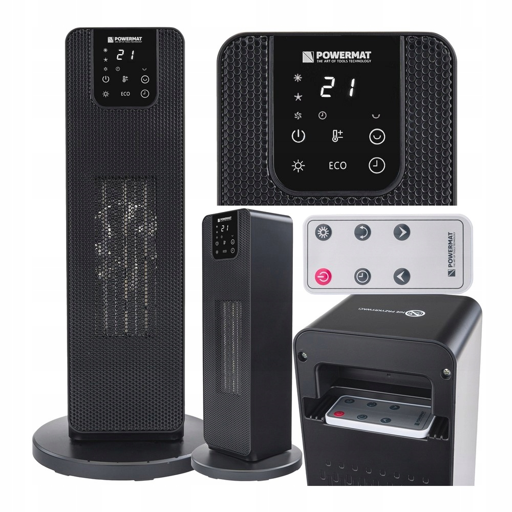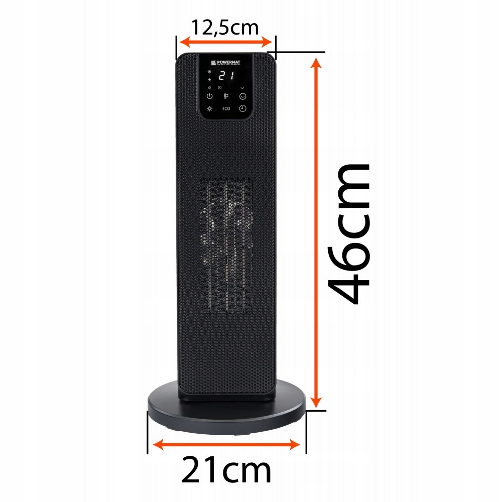 Moc 2000W | 2 nastawy mocy | Tryb ECO | Oscylacja | Dotykowy panel sterowania LCD | Zabezpieczenie przed przegrzaniem | Timer | Termowentylator