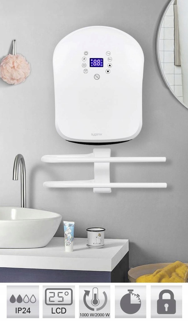 Żądaną temperaturę można zaprogramować w zakresie od 5 do 35 stopni Celsjusza, a dostępne są dwa poziomy ogrzewania 1000 lub 2000 watów. A od teraz ręczniki kąpielowe zawsze znajdą swoje należne miejsce na dwóch wieszakach.