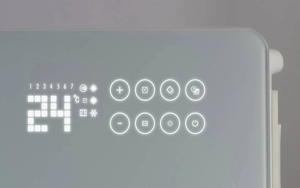 Elegancki szklany grzejnik ścienny o wysokiej jakości wykonania i dużym wyświetlaczu LED doskonale wpasowuje się w nowoczesne wnętrza.
