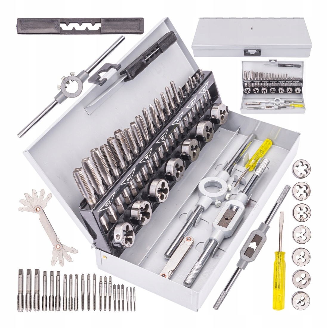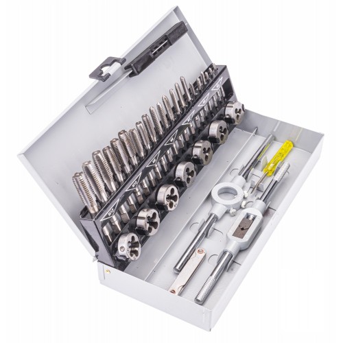 Praktyczny zestaw gwintowników i narzynek M3 - M12. W skład zestawu wchodzą 32 różne narzędzia wykonanych z wysokogatunkowej stali. Całość umieszczono w metalowej walizce do transportu i przechowywania.