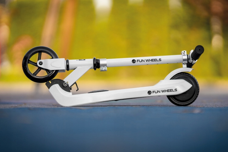 Dziecięca hulajnoga elektryczna Fun Wheels posiada wbudowany w platformę nożny napęd, jednak w przeciwieństwie do tradycyjnych modeli hulajnóg elektrycznych pojazd ten ruszy dopiero po odepchnięciu. To znacznie zwiększa bezpieczeństwo i podnosi komfort podczas jazdy.