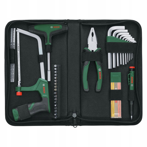 41-elementowy zestaw mieszany, zawierający wkrętak z końcówkami i uchwytem w kształcie litery T, szczypce uniwersalne 180 mm, piłkę do metalu 150 mm, pisak do zaznaczania głębokich otworów, 10 kluczy imbusowych, 18 bitów, 2 brzeszczoty do piłki do metalu.