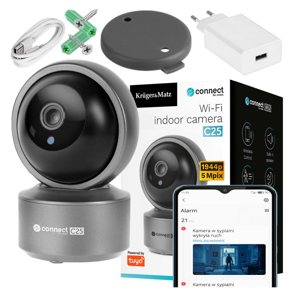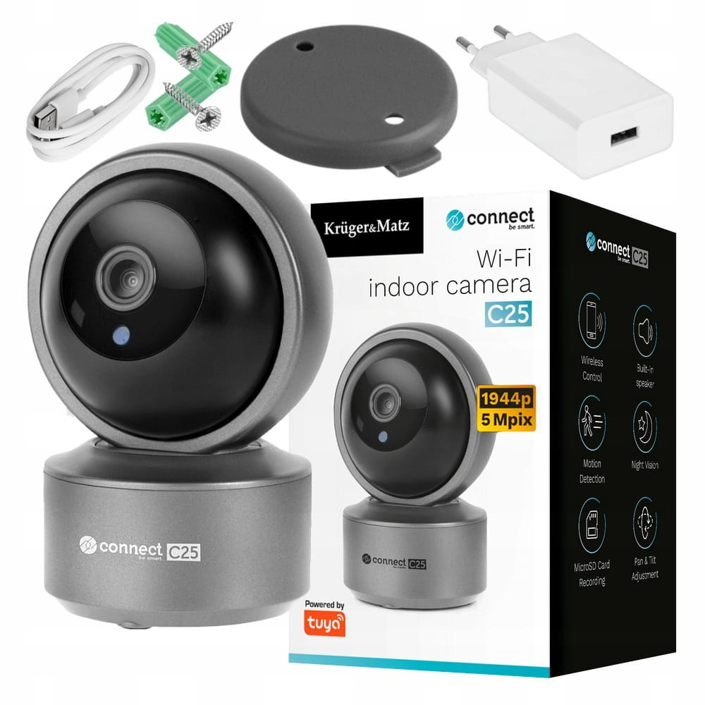 Kruger&Matz Connect C25 umożliwia precyzyjne monitorowanie dowolnego pomieszczenia. Dzięki rozdzielczości 5 Mpx (2592 x 1944 px) nagrania są wyraźne i pełne szczegółów, co jest idealne do nadzoru Twoim w domu lub biurze.