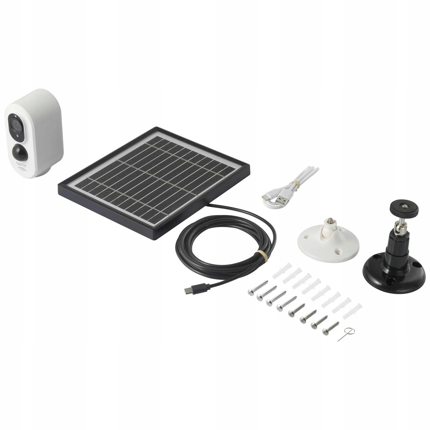 Oprócz kamery z modułem słonecznym i kablem USB dostawa obejmuje wszystko, co jest potrzebne do instalacji, od kołków i śrub po wsporniki.