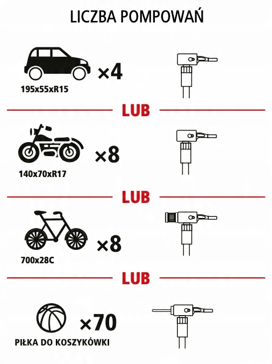 Pojemny akumulator (2,0 Ah) pozwala na napompowanie do 4 opon samochodowych (rozmiar 195x55 mm), co jest idealne na dłuższe wyjazdy bez dostępu do gniazdka.