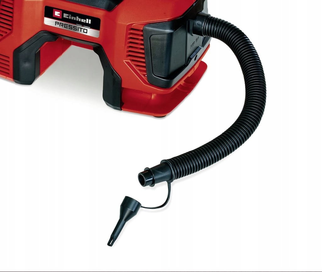 Praktyczne funkcje obejmują funkcję automatycznego wyłączania po osiągnięciu ustawionego ciśnienia oraz przełącznik przyciskowy do pompowania w zakresie wysokiego ciśnienia bez wstępnego ustawiania ciśnienia. Kompresor akumulatorowy jest wyposażony w schowek na 3-częściowy zestaw adapterów.