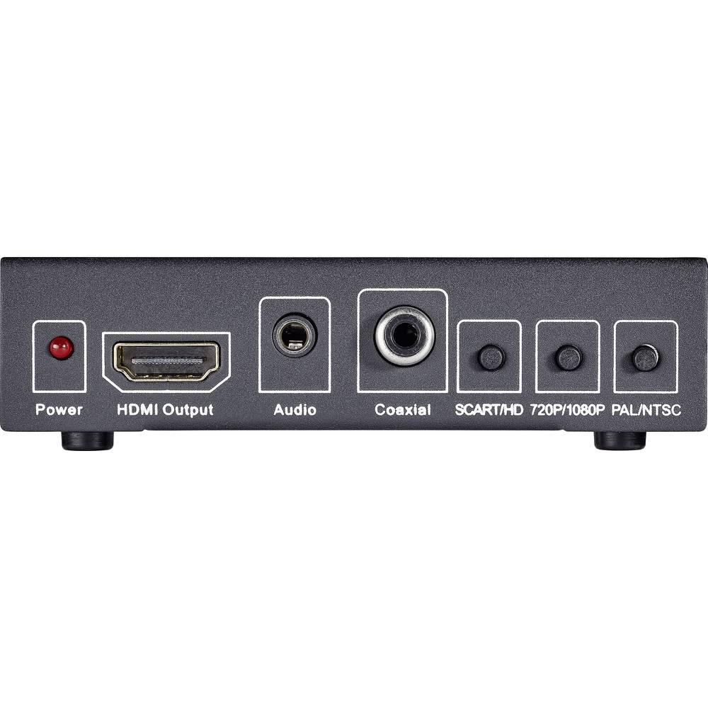 Konwerter z funkcją upscaler przetwarza analogowy sygnał obrazu i dźwięku SCART na wysokiej rozdzielczości sygnał HDMI.
