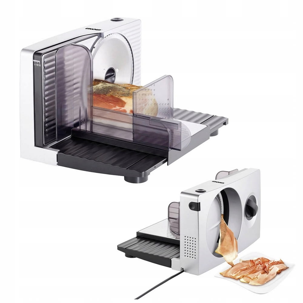 Wytrzymała krajalnica o mocy 100 W z precyzyjną regulacją cięcia od 0 do 15 mm do czystego, szybkiego i łatwego krojenia mięsa, wędliny, chleba, bułek, ciast, owoców, warzyw i wielu innych.