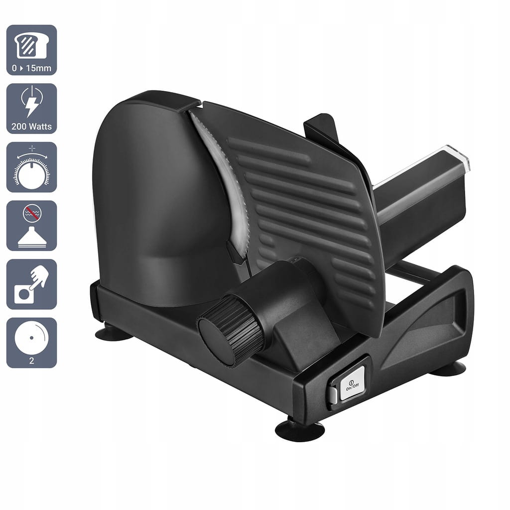 Wytrzymała krajalnica o mocy 200 W, obudowa ze stali, 2 noże ze stali nierdzewnej z precyzyjną regulacją cięcia od 0 do 15 mm do czystego, szybkiego i łatwego krojenia mięsa, wędliny, chleba, bułek, ciast, owoców, warzyw i wielu innych.