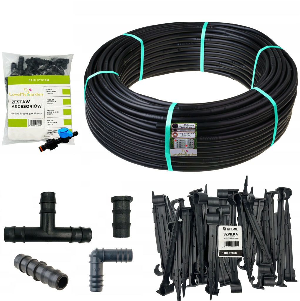 W naszym zestawie znajdziesz niezbędne elementy do efektywnego nawadniania Twojego ogrodu. Z dumą prezentujemy linię kroplującą o długości 100m, średnicy 16mm i rozstawie kroplowników co 33cm.