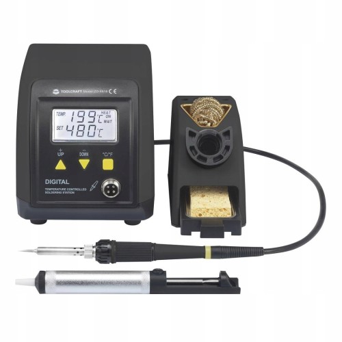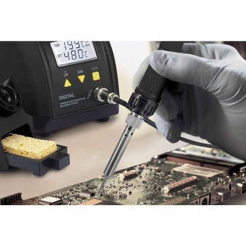 Stacja lutownicza posiada duży i podświetlany wyświetlacz LCD, który informuje w dowolnym momencie o aktualnej temperaturze kolby lutowniczej. Temperaturę lutowania można precyzyjnie ustawić w krokach co 1°C za pomocą przycisków góra-dół. Chowany uchwyt gąbki bezpośrednio pod podstawką lutownicy ułatwia czyszczenie grotu lutownicy podczas lutowania.