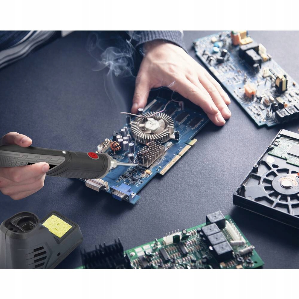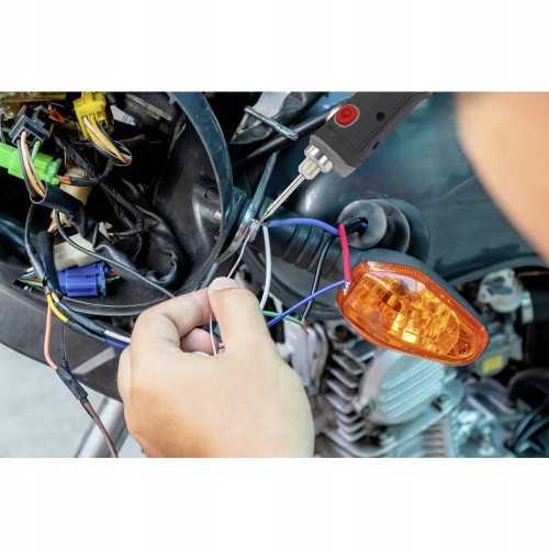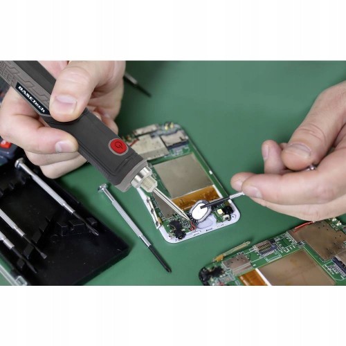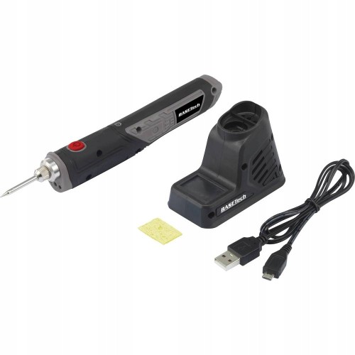 Bezprzewodowa lutownica ze zintegrowanym akumulatorem 1500 mAh. Nieprzerwana praca przez 60 minut lub do 1000 połączeń lutowanych. Reflektor roboczy LED jest załączany podczas pracy lutownicą, aby oświetlić obrabiany element. Lutownica jest lekka i przenośna. Nadaje się do użytku w miejscach gdzie nie mamy dostępu do standardowego zasilania. Polecana do montażystów sprzętu car audio oraz elektryków samochodowych podczas zarabiania przewodów, kostek itp. Na wyposażeniu praktyczna podstawka do odkładania rozgrzanej lutownicy.