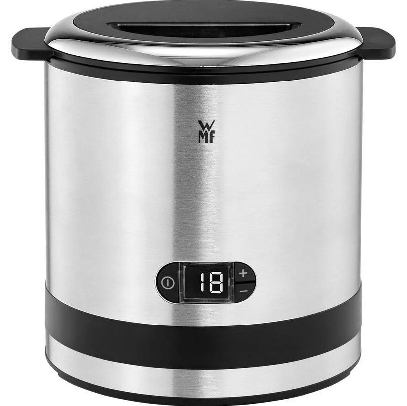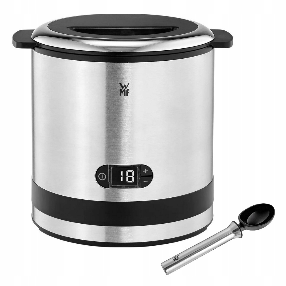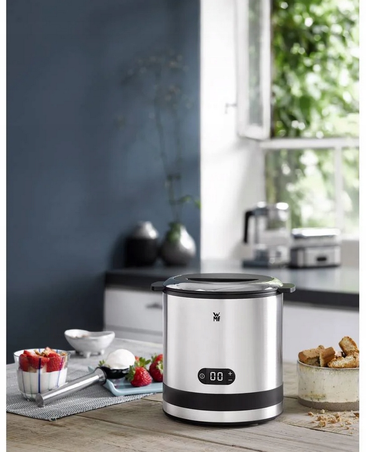Możesz samodzielnie przygotować pyszne sorbety, kremowe lody i mrożony jogurt w ciągu zaledwie kilku minut za pomocą kompaktowej maszynki do lodów WMF KÜCHENminis® 3w1. Po prostu umieść owoce, pistacje lub inne składniki według własnego gustu w eleganckim, wyjmowanym pojemniku przeznaczonym do zamrażarki o pojemności 300ml. Obrotowe mieszadło i sprytna kontrola czasu zajmą się resztą. Lodowe wersje można porcjować i podawać bezpośrednio za pomocą dołączonej łyżki do lodów.