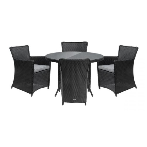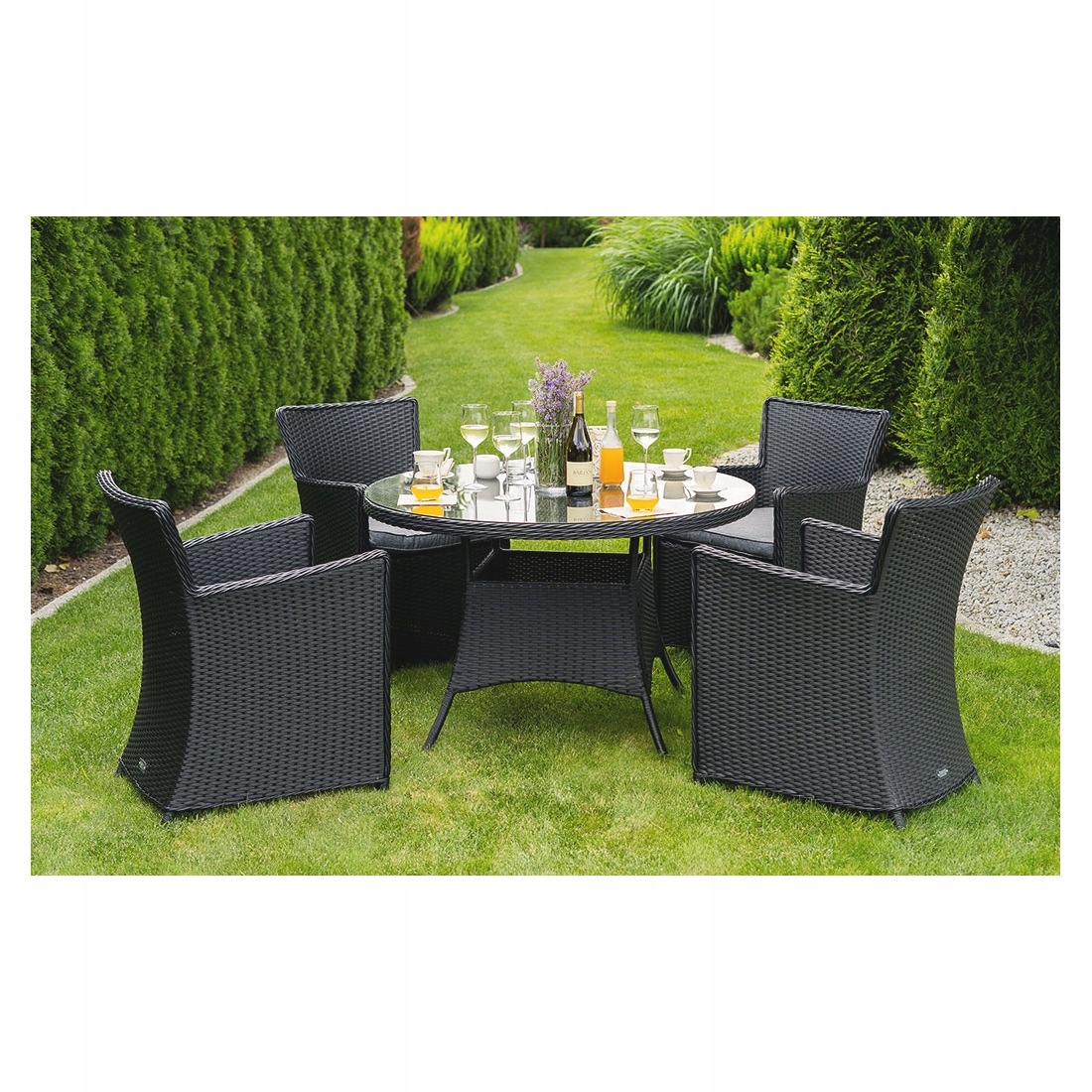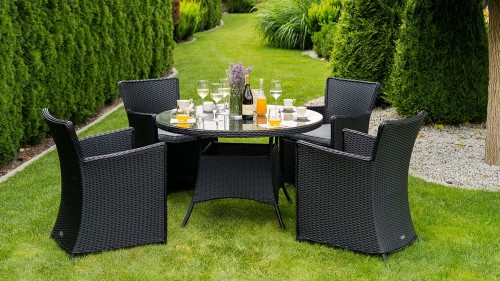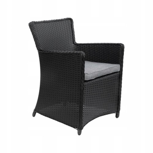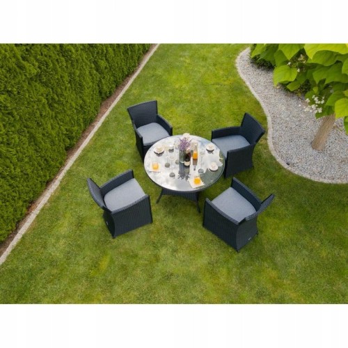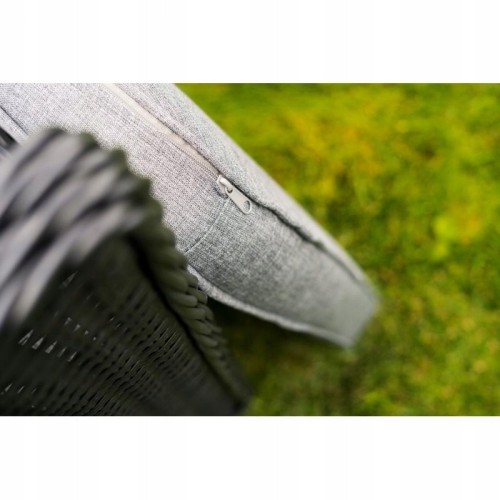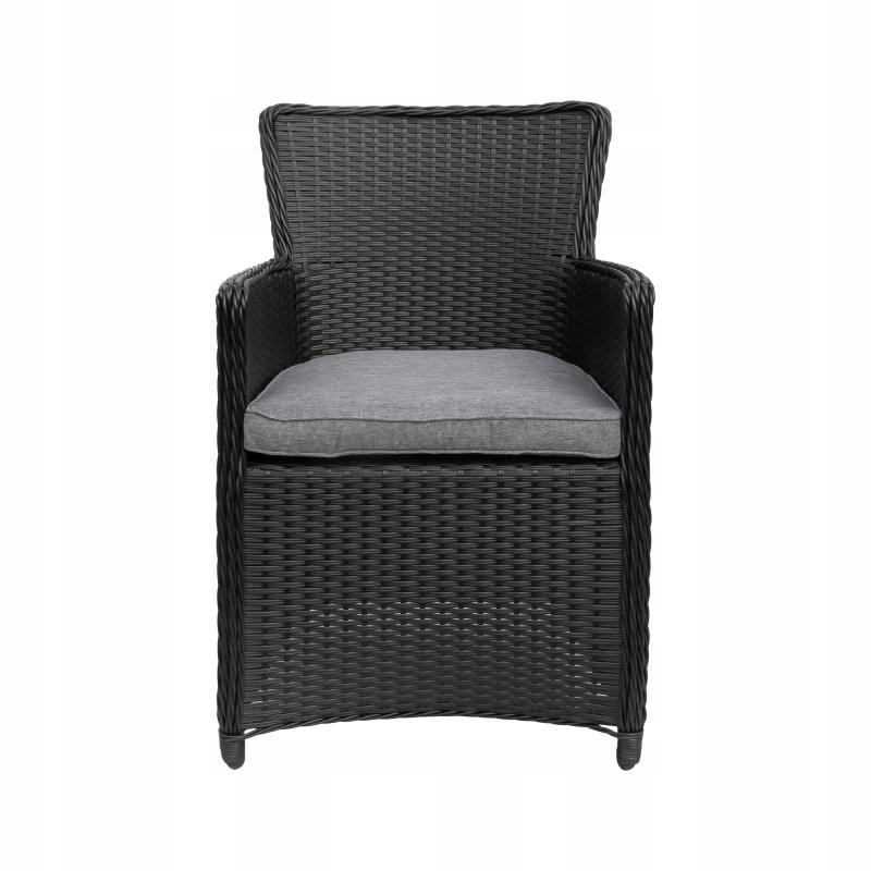 Długa żywotność i stylowy wygląd to nie jedyne zalety zestawu ogrodowego! Na uwagę z pewnością zasługuje blat stołu ogrodowego, który został wykonany z wytrzymałego szkła hartowanego. Oznacza to, że bez obawy możesz postawić na nim gorące naczynia. Jeśli chodzi o fotele, to oprócz wygodnych podłokietników, ich komfort zwiększają miękkie poduszki ogrodowe, które zdecydowanie umilą Tobie i Twoim najbliższym relaks. Zestaw ogrodowy stawia na klasyczny design, dlatego elegancka czerń technorattanu została połączona z doskonale komponującymi się biało-szarymi poduszkami.