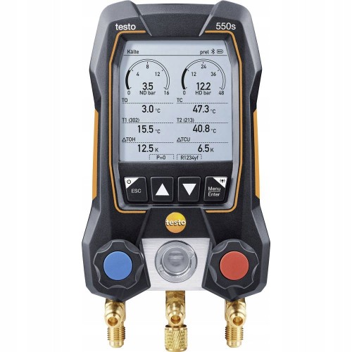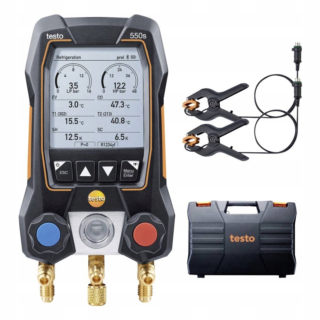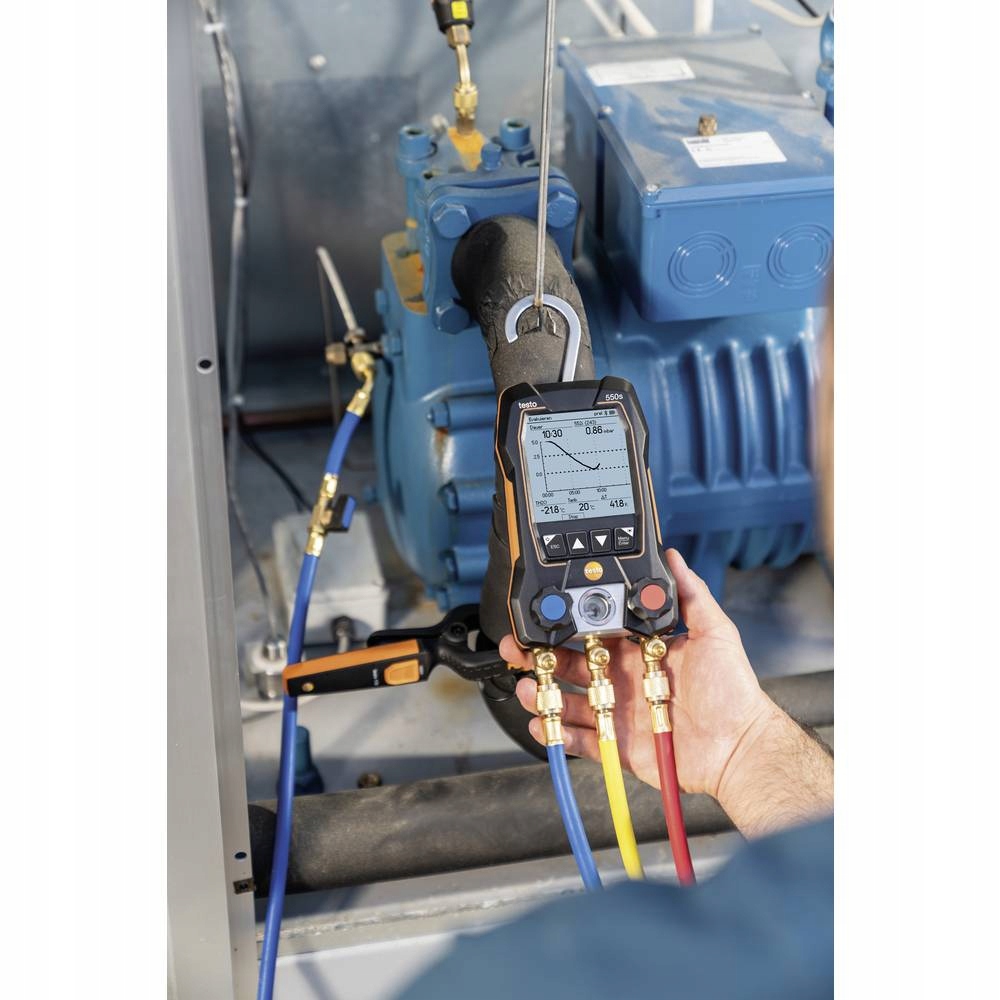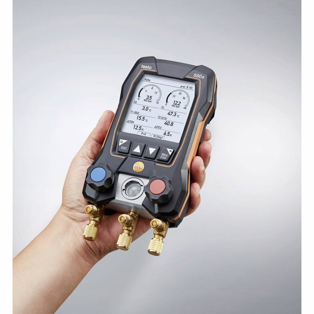 Testo 550s Basic - elektroniczna oprawa zaworowa Bluetooth z 2-drożną baterią zaworów, do uruchamiania, serwisu i konserwacji instalacji chłodniczych i pomp ciepła.