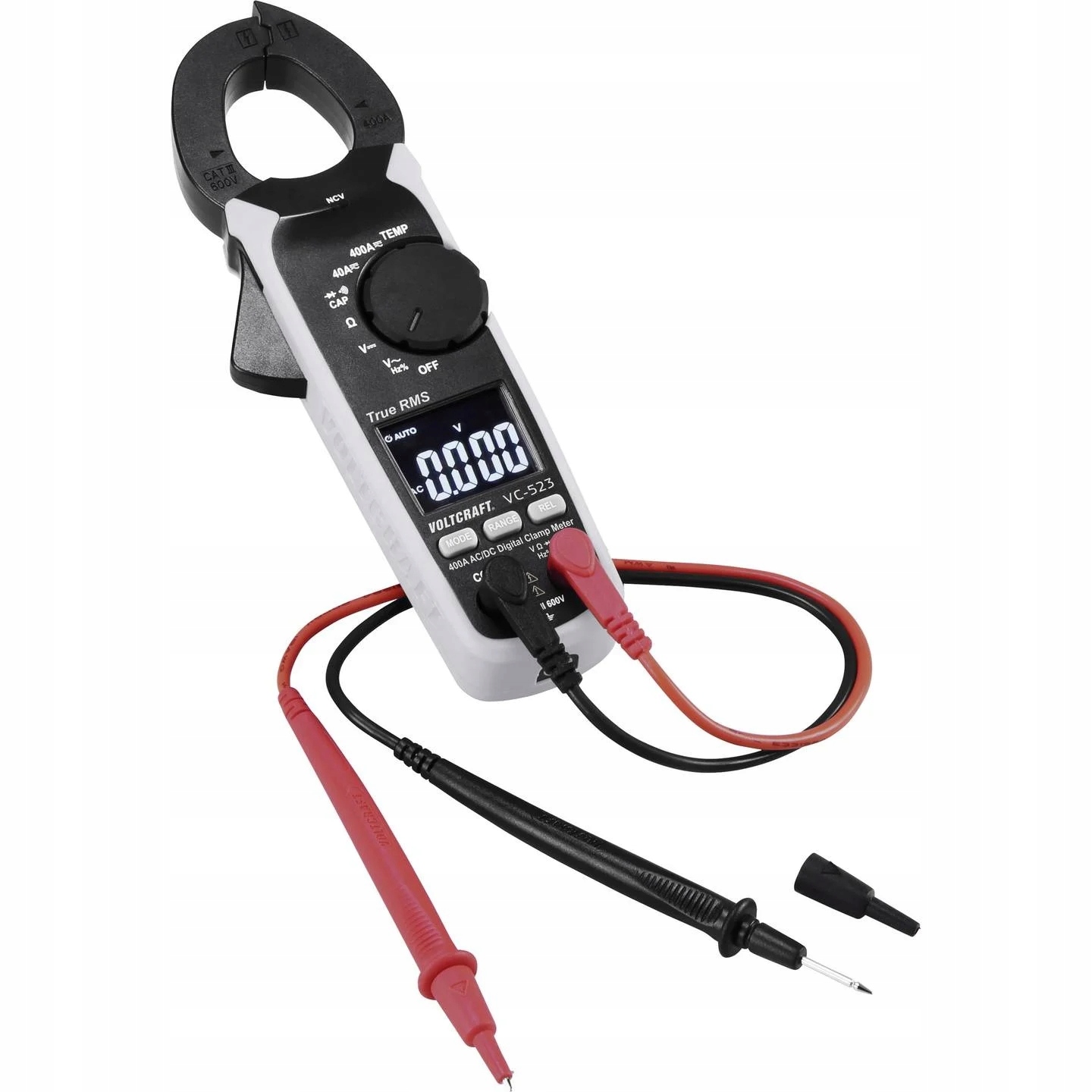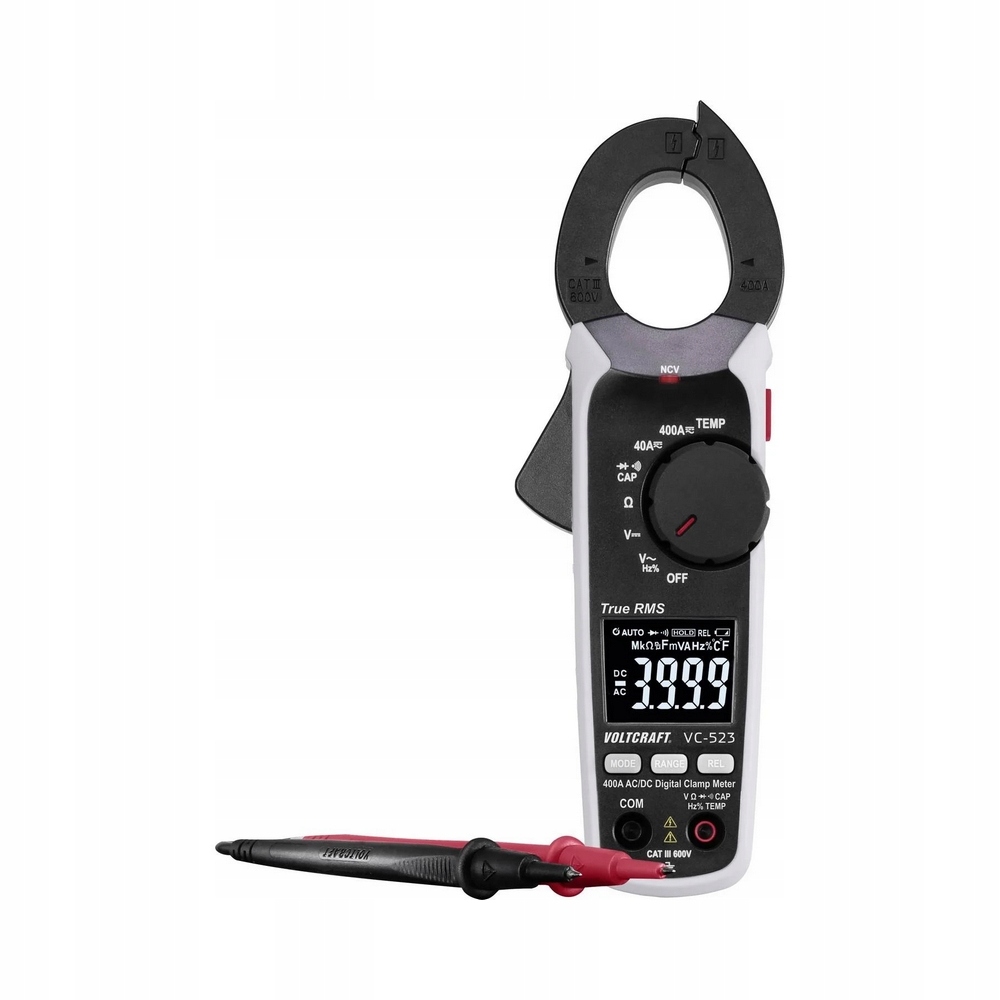 Miernik cęgowy jest wyposażony w funkcję pomiaru temperatury z termoelementami typu K. Załączony czujnik temperatury powietrza można opcjonalnie wymienić na wszystkie czujniki termoelektryczne VOLTCRAFT typu K do pomiaru mieszanin, cieczy lub powierzchni do 760 ° C.
