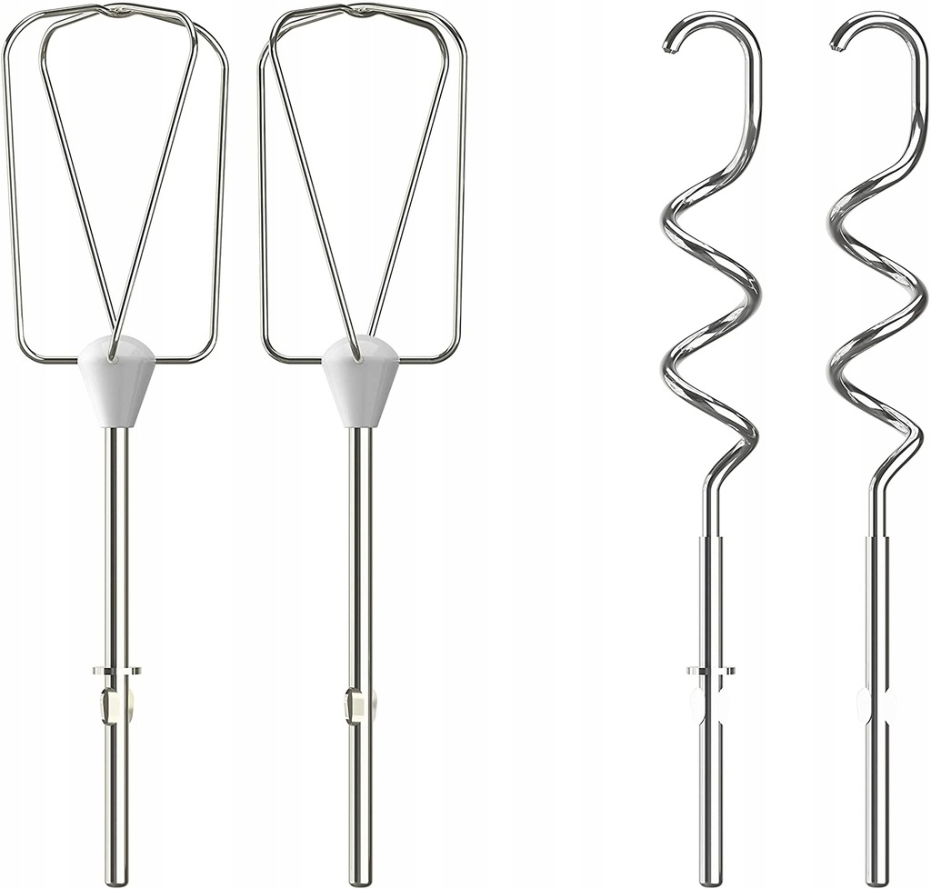 W zestawie znajdziesz 2 wytrzymałe trzepaki i 2 haki do ciasta. Trzepaki przydadzą się do ubijania śmietany, piany z białek lub kremów do ciast.