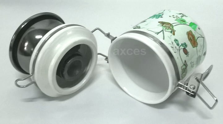 Ceramiczny pojemnik zaopatrzony w uszczelkę silikonową. Metalowa klamra zapewnia szczelne zamknięcie pojemnika.